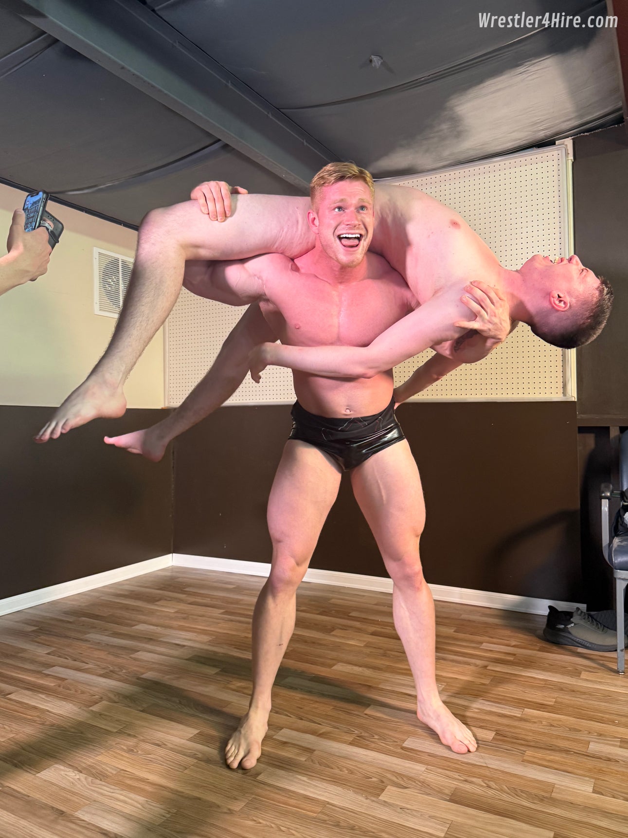 Jim explains with a grin: “His best man hired me to stage a bachelor prank — a photo shoot where the groom-to-be gets caught in a few wrestling holds. The idea’s to send the pictures to the wedding party. But I can’t take photos and do the wrestling at the same time.”