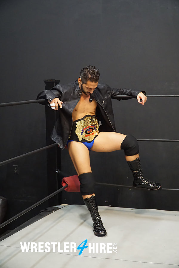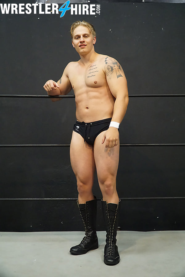 Chase takes his time peeling himself out of his leather jacket, using the time to sizeup the taller, bigger challenger. Chase hands over his champion belt, revealing those manly abs that have made him a legend. Iceman is itching to fight, pacing the ring like a nervous rookie with his speedos wedged in his butt. Chase senses the challenger’s nerves, and uses them to his advantage. It’s a game of cat and mouse...but Iceman doesn’t realize he’s the mouse. Chase winds his powerful python legs around the blonde bruiser’s body, entangling him like fly in a spiderweb, and closing his superior bicep tightly around his neck until Iceman’s inflated abs release.