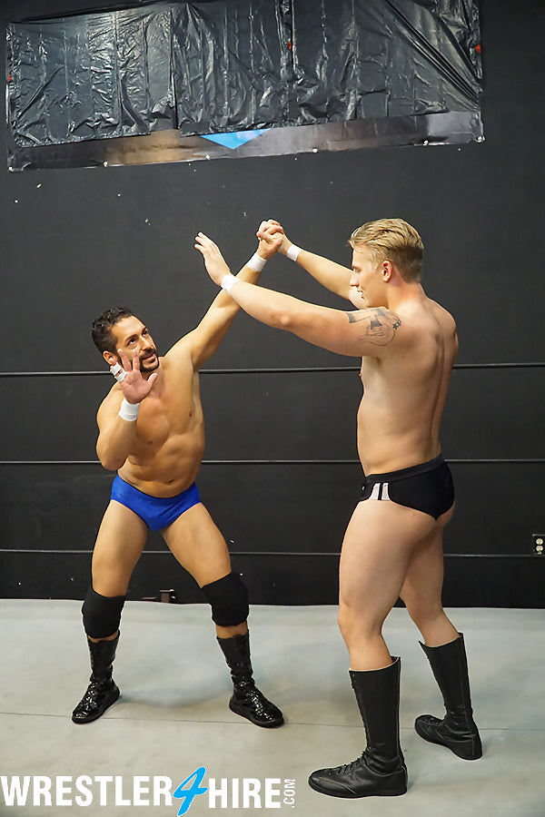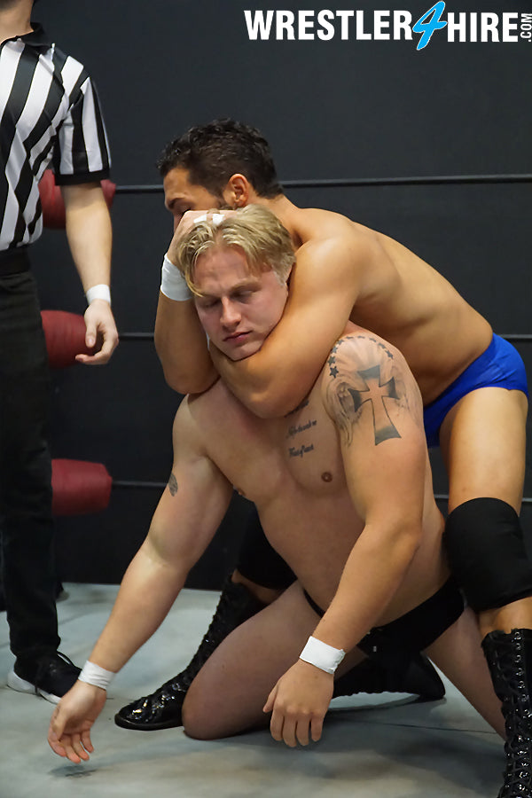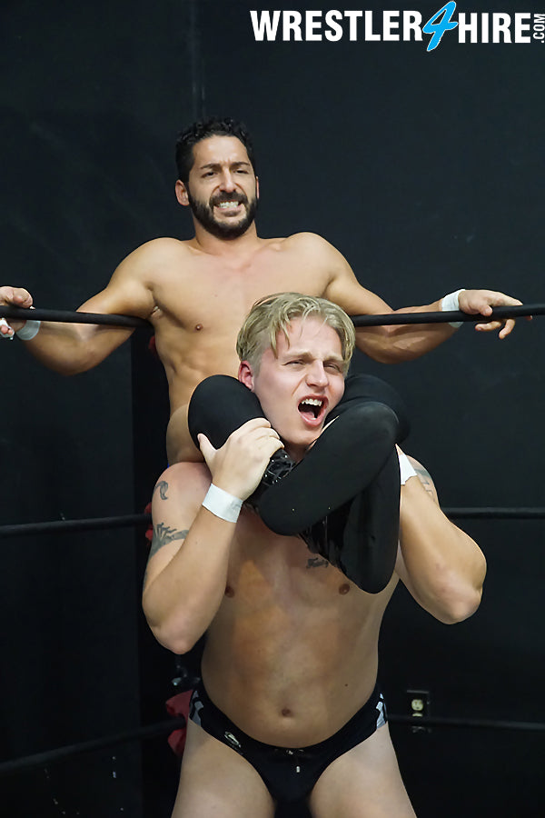 This is one of my favorites! I love how the handsome, cocky new guy Iceman gets totally humiliated and defeated by a fiendish heel! Iceman may start off strong, but he doesn't stand a chance, for Sinn has some unfair tricks up his sleeve! It's fun to watch Sinn repeatedly put Iceman in sleeper hold after sleeper hold, and even the ref cannot stop the brutal beatdown Iceman is in for. Iceman's perfectly styled golden hair was made to be pulled by underhanded heels, and Sinn frequently grabs, pulls, and messes up the hero's pretty hair throughout the match. Iceman may fight valiantly, but Sinn grinds him down until Iceman has no fight left. In this match Iceman learns that his place is beneath Sinn's boot! A must have for lovers of squash matches!