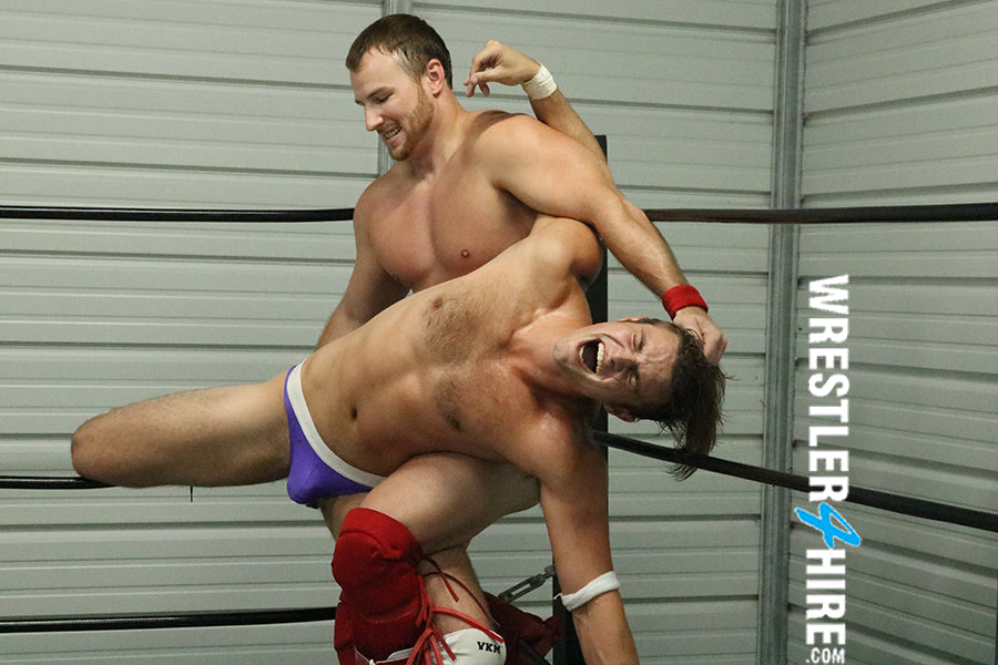 It’s two big, beautiful, bodacious brawlers going hard, as Cooper unleashes his arsenal of pro moves and submission holds, while dragging the cocky Jacob around the ring by his pretty hair. Arms are cranked and wrenched, rookie abs are pounded and pressed, and experience wins out once again, mopping the mat with this handsome new meat...who looks great covered in sweat and screaming for mercy!
