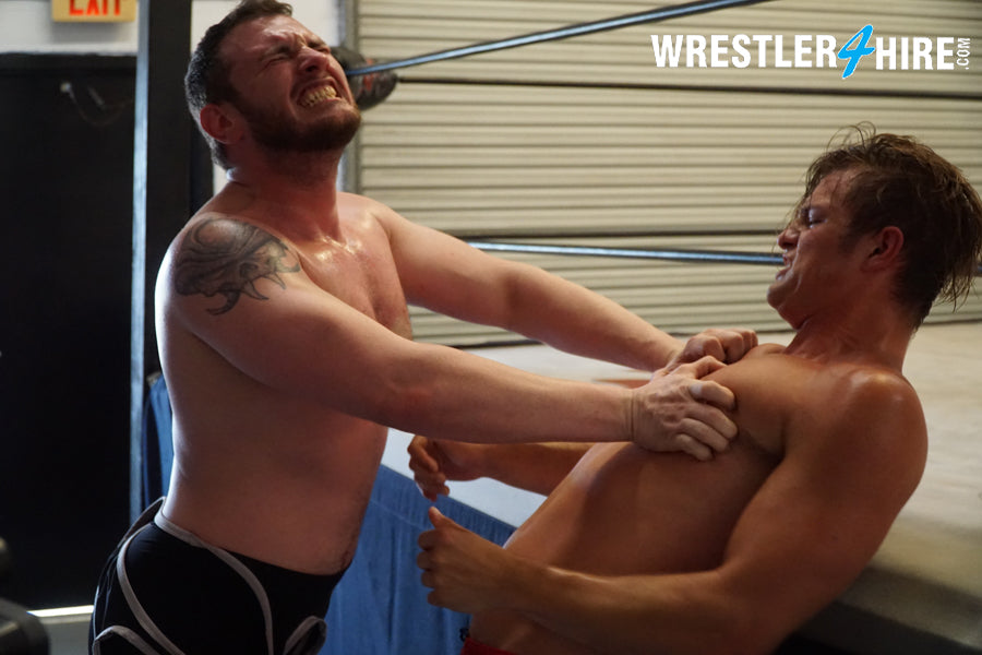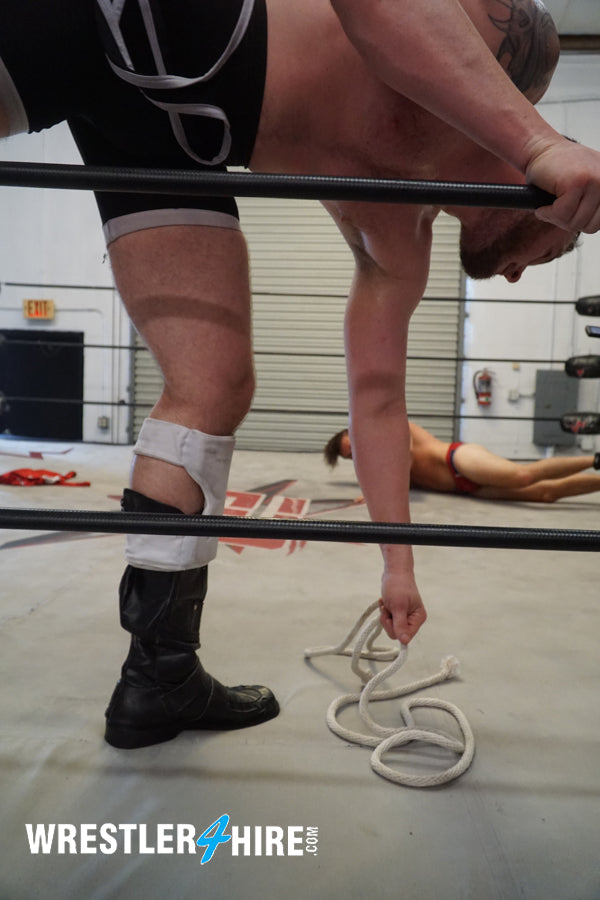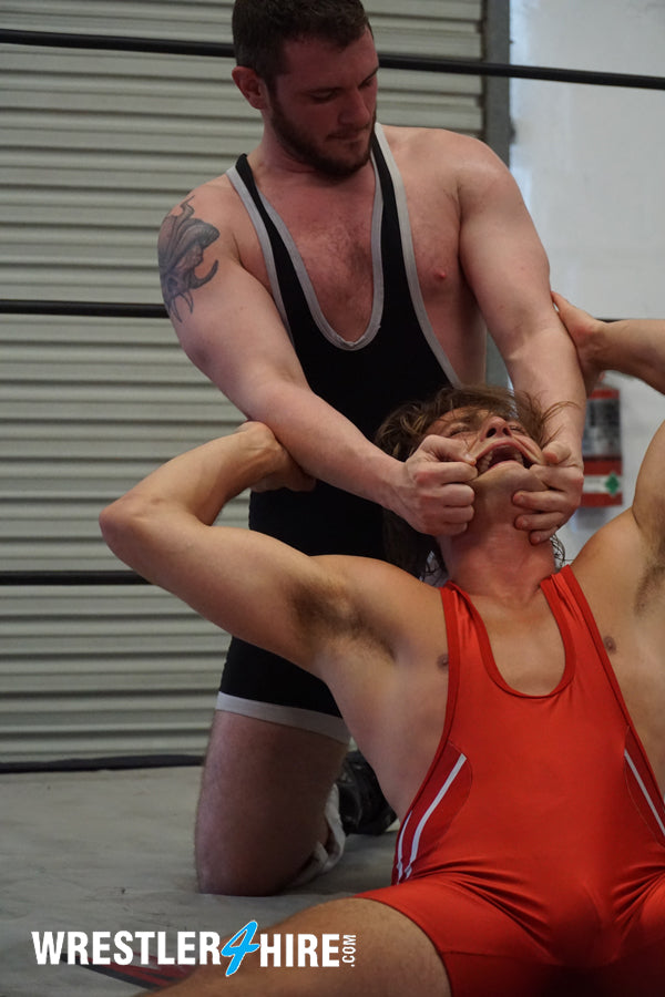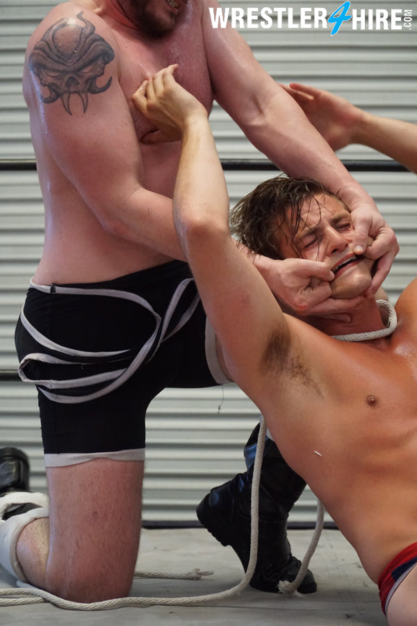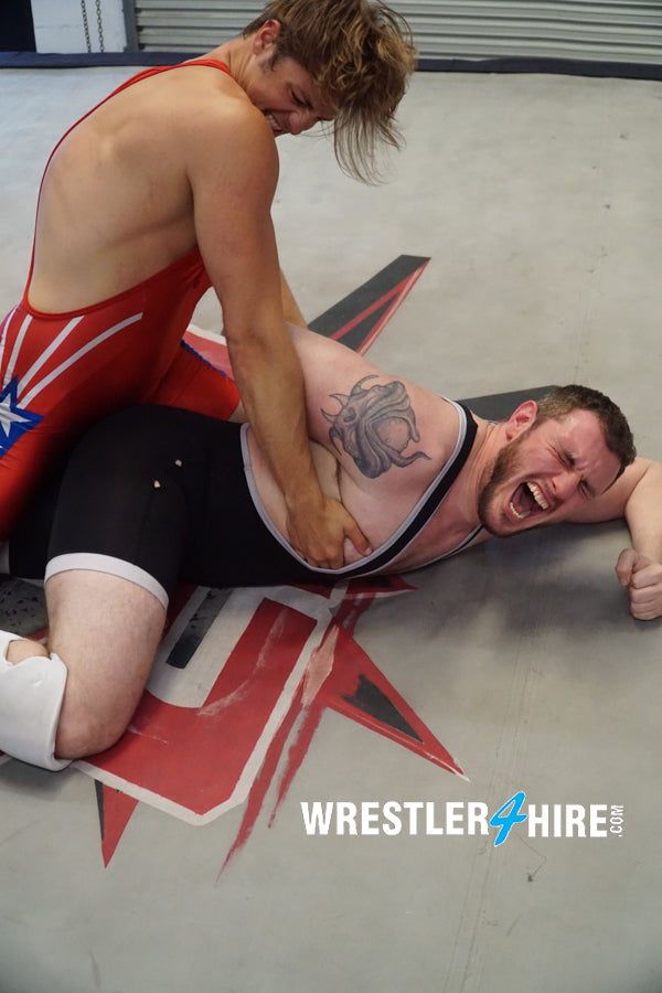 “My minion has escaped…” hisses Justice, creeping toward Van Acker with menace in his eyes. Justice is big, bearded, beefy, and brilliant in boots and knee pads, his bodacious butt looking epic in his singlet. Van Acker attacks, and Justice loves it...begging like a growling masochist to have his nipples pinched. Justice makes good use of VanAcker’s hair, as the two tangle and twist, sleek singlets sliding against one another in almost erotic ecstasy. Van Acker drives his ass into Justice’s in a Boston crab that gets Justice apologizing and moaning in painful pleasure. Van Acker can’t tell if his punishments are working or not, as Justice seems to love every excruciating moment!