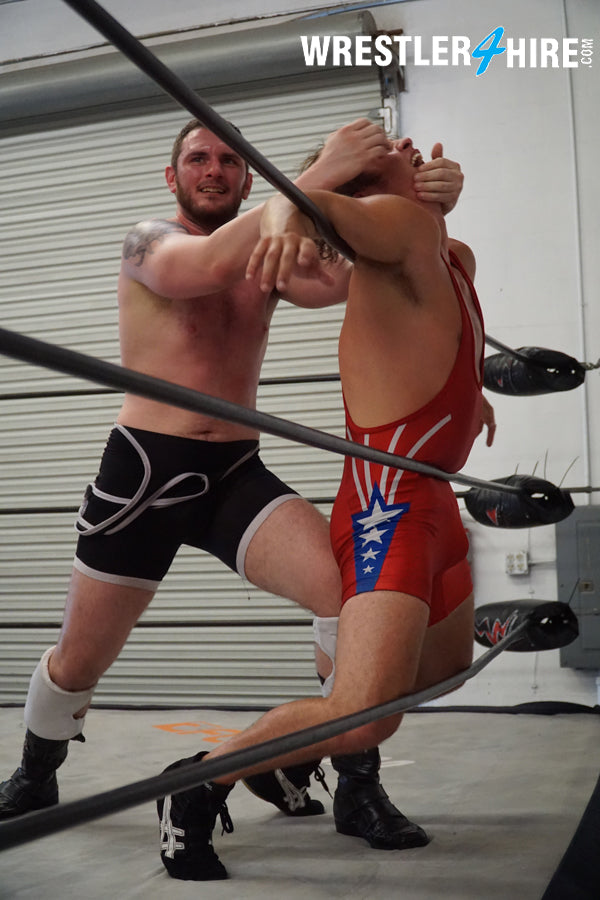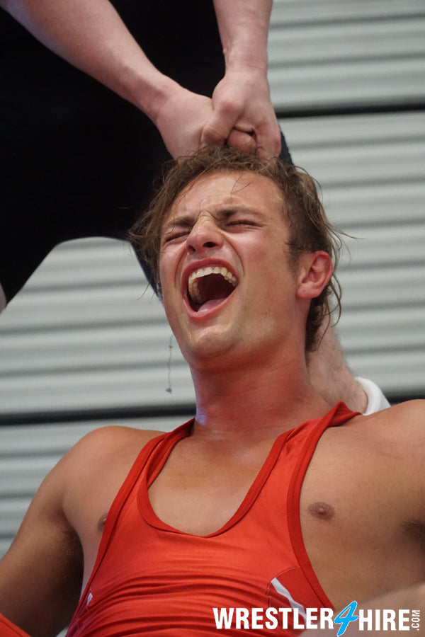 Singlets! Sleek, skintight, revealing singlets. For some wrestling enthusiasts, they’re an obsession. For energetic jobberpunk Jacob Van Acker, they’re torture devices. As the golden hunk stretches in a red singlet that perfectly frames his flawless arms and sexy armpits, the one and only Nick Justice rises up from below the ring as if from the underworld in a black singlet of his own!