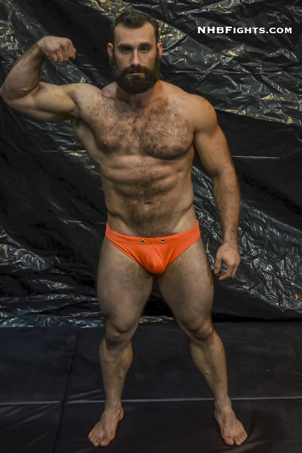Paricutin is a unique wrestler. Fans will instantly appreciate his incredibly long and lean frame. He’s almost impossibly thin, with a handsome face, dark hair, and a serene presence. His lengthy feet flex and adjust as he stretches in a miniscule blue speedo that leaves nothing to the imagination. Jaxton Wheeler — on the other hand — is a massive, hairy manbeast with a protruding package barely contained within bright orange speedos. His thighs, chest, biceps, back, and full beard are the very picture of masculine perfection.