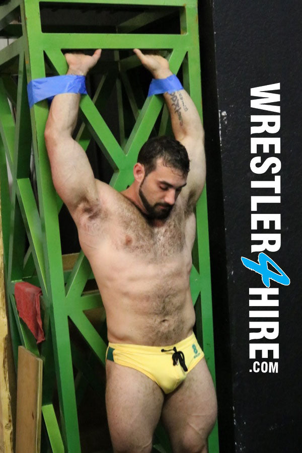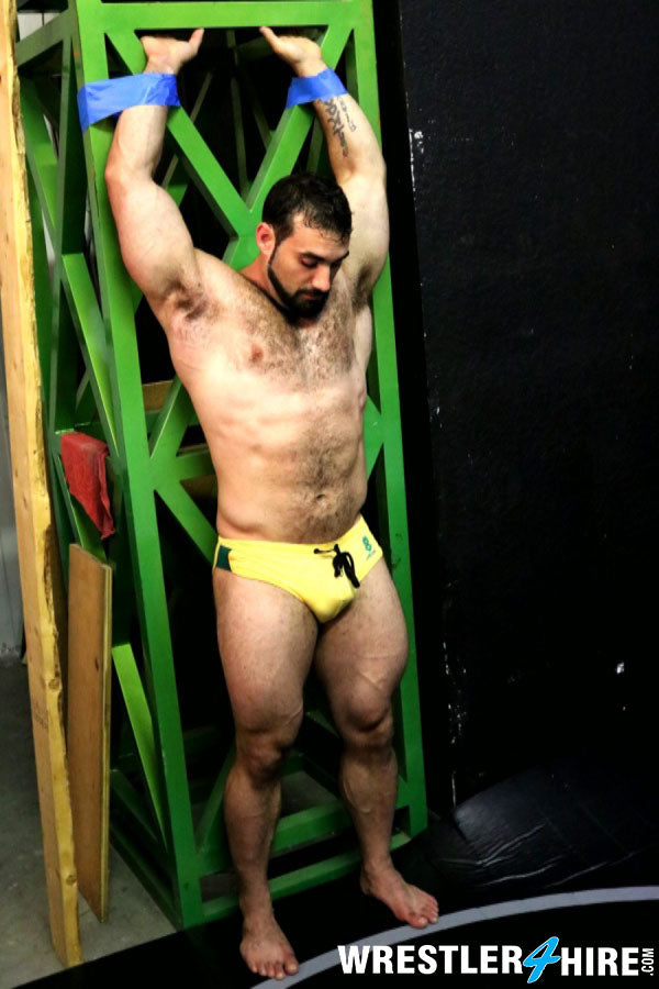 Hairy beefcake Wheeler writhes and contorts in Zebu’s grip, offering only the weakest resistance. Zebu responds with more of his magic juice, which allows him to move and manipulate the massive man like a lump of hairy, sexy clay. Watch as Rendell’s oiled up abs glisten in the light as he torments his prey like a particularly wicked serpent.