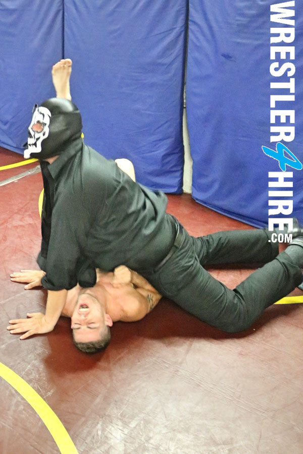Jayden is stretching and preparing for his rematch with Josh Rotner. In walks Max Quivers. Jayden asks him what he’s doing there and he replies that Josh has hired him to handle the rematch for him. Jayden says he wants to wrestle Josh and not some fat guy in a mask. He’ll soon regret that comment as Max is as mean as he is big. Poor Kayden tries to leave, only to have the big man stop him, shove him into the wall, and put him in a painful bearhug. Max says he loves squashing little twinks, but Jayden snaps back that he’s not a twink and he has a bet with Josh that the loser calls the other one “Daddy” for a night. Jayden repeats that he’s not going to wrestle a fat man in a tie and a mask. Jayden takes control with a hammerlock, followed by an arm bar, quickly gaining control, but releasing the hold before Max submits. Could Jayden actually win this match against a much bigger opponent?
