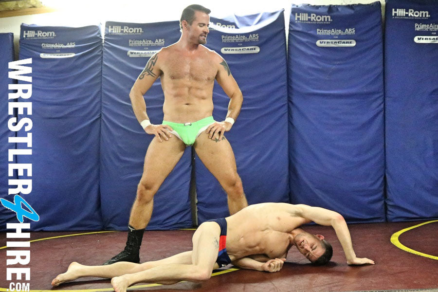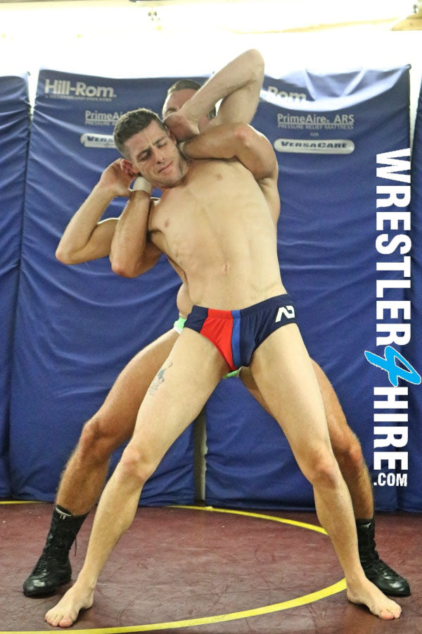 Jobe Zander looks even more yummy coming into this match wearing one of the smallest speedos I've ever seen him in. His foe for the evening is the smaller but very determined Jayden Mayne. Jayden looks sexy as ever in his bare feet and sporting a fresh haircut. He fills out his bulging speedos very well. Almost making it hard to focus on the action.