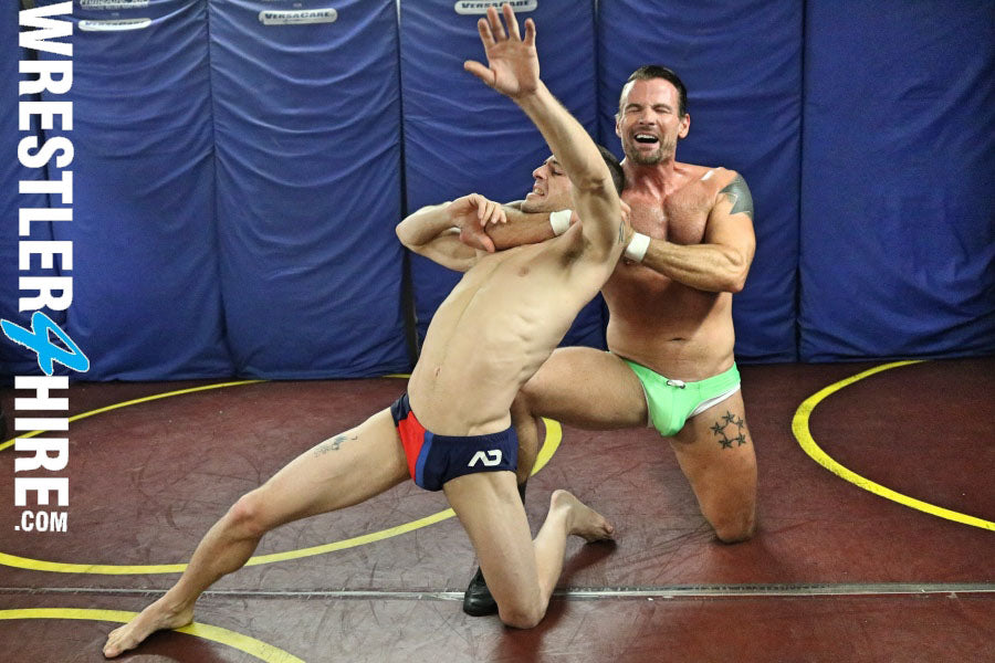 As you might expect, the seasoned pro wrestler and underground legend, Jobe dominates most of the action. Jayden takes everything the big hunk can dish out and stays in the fight all the way to the end. Lots of great closeups of the lightweight cutie suffering at the hands of the sexy older heel.