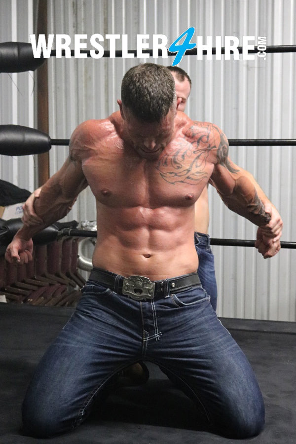 YIPPEE KI-YAY, LET’S RIDE!!! This match is HOT, but even more so for those who have a cowboy fetish of any kind. Say what you will, but there’s some freaking hot about a shirtless cowboy in tight jeans and boots. This match opens with sexy Austin Cooper having Blake Starr hogtied and helpless. One can only imagine what Austin has in mind for his powerless and very vulnerable victim. In walks massive muscle man, Joey Nux. Joey says, “Looks like you’ve got yourself a calf there” to which Austin replies, “Yeah, I’ve got one.” Joey asks, “You can hogtie a calf, but can you hogtie a bull?” Austin states that he has just put his hat back on and dried off his sweat, but it’s fine and he’s not afraid of a little hard work. A little hard work? Austin is from Texas and is a highly skilled wrestler with extensive mat and ring experience, but Joey is one massive rock of muscle and we are not convinced he can be hogtied. We aren’t sure what the boss had in mind with this match, but we are anxious to see what happens.