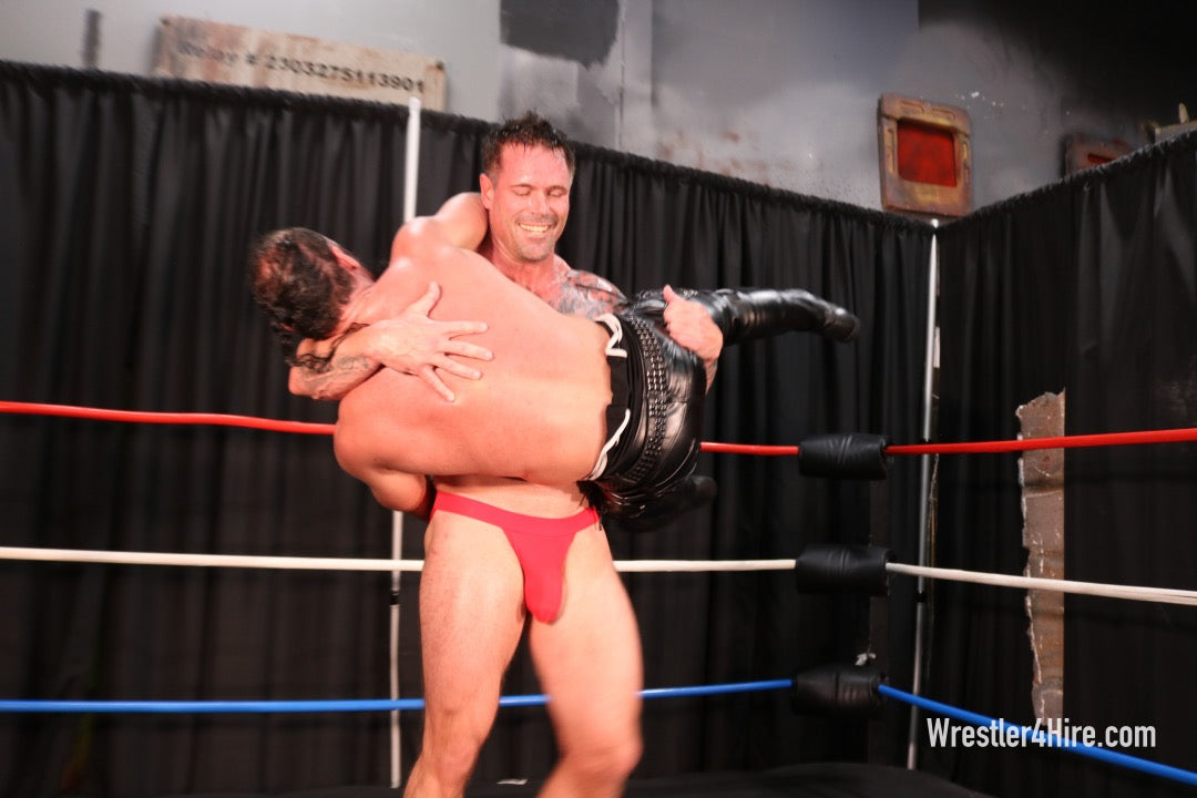 The 2 masculine musclemen lock fingers in several tests of strengths - the BEAST IS UNLEASHED and Joey rips his shirt off too. The two trade blows early, until they decide to drop to the mat for a good old fashioned arm wrestling encounter, which Kris quickly ends with a surprise move before an actual winner can be decided. Kris is not above devolving into some rather unsavory moves, including biting his opponent, something that Joey does not take too kindly too. In contrast, Joey is all about power, slapping on bearhugs and full nelsons to hurt his opponent, and hoping that his shear size might just nullify some of Kris' skills and prevent him from being able to slap on some of his more devastating moves.