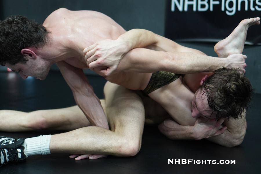Now Nathan is rethinking his strategies. Both men tied up, and for a moment it look s like it’s gonna be a gentlemanly game of dancing around, when suddenly both men are driving full force into the mat in a messy bid for superiority. Grinning John pulls Nathan into a spladle. The camera captures the humiliating hold up close, as Nathan’s miniscule speedo barely contains anything. Nathan grips at John’s bare ankle, his face a contortion of rage and pain. Pelvis to pelvis, they strain and glare with hateful expressions. John wraps his legs around Nathan’s neck, leaving the already miserable man to arch and buck in desperation before finally tapping. This is gonna be one hell of an even match!