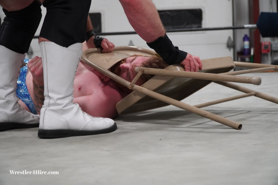 Jonny is nothing if not fair though, and so he takes the time to make Forrest's back equally red with several massive stomps to the center of Forrest's back. Soon, all parts of Forrest and crimson and Jonny is just getting started. There is no respite for Forrest, no safe space for him. When Jonny does throw him outisde the ring, the beatdown takes and ever more sadistic turn. Brooms, fans, and garage doors all factor into what Forrest's body is thrown into. And when Jonny decides to move the action back into the ring, he does so while bringing a steel chair with him.