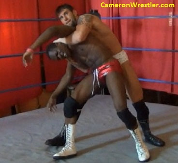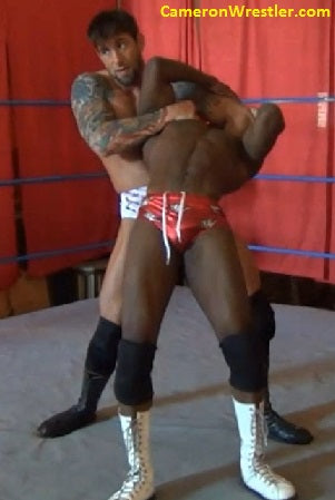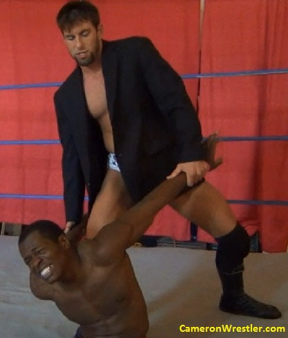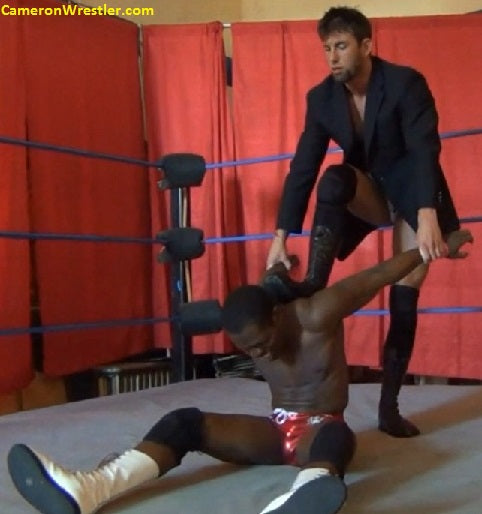 While smashing the boy-next-door between his crushing legs, Karn demands a song. Can James sing his way out of this bear-trap? Karn’s bicep firmly planted in the rookie’s neck suggests not, but hearing James attempt to apologize for being a disrespectful bitch is pretty damn amusing!