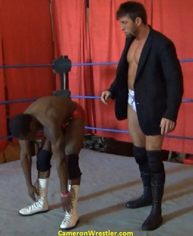 Today’s pathetic victim, handsome boy-next-door Alvin James! With the body like a small super hero and that cute grin, this adorable puppy just wanted to play, and nobody plays quite like Karn, who goes to down on James’s legs, arms, neck, and chest. Boots collide with abs and heads, and vicious midsection squeezing forces James to beg for a friendly game of cards instead. Karn begins to contemplate the need for a few sessions of painful punishment, boxing the rookie’s ears, knocking him face-first into the ropes, and calling him out for being ungrateful, and unready for a coveted place in the rat back.