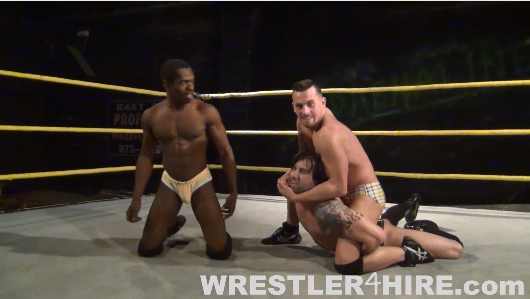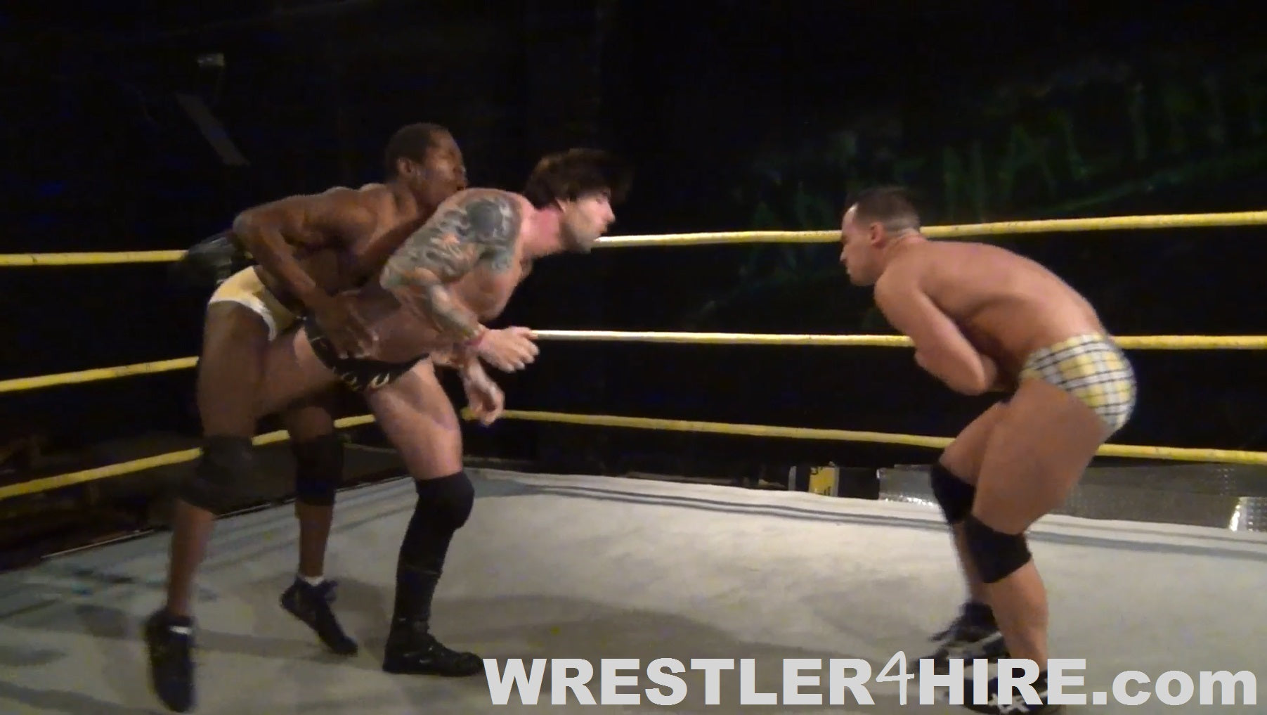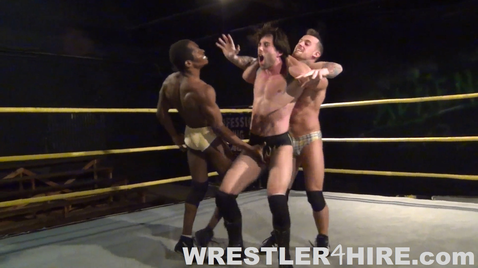 Yeah, these two dudes have their minds on only one area...Karn’s groin. But this ain’t no Double Teamed match! Suddenly Karn has both boys trapped in a double headlock, a move that only enrages the Tweedles to a heightened level that puts everybody’s junk on the line.
