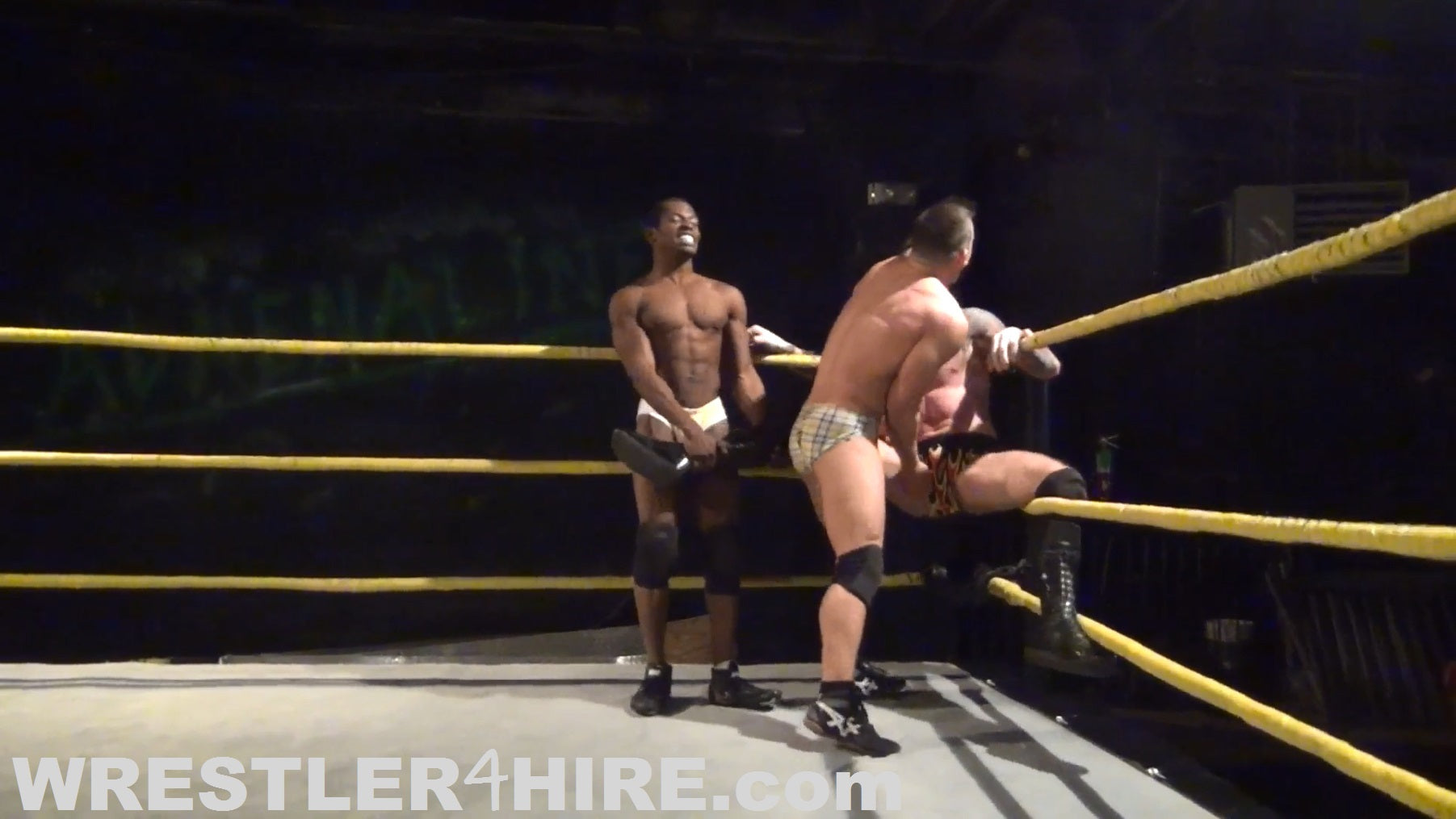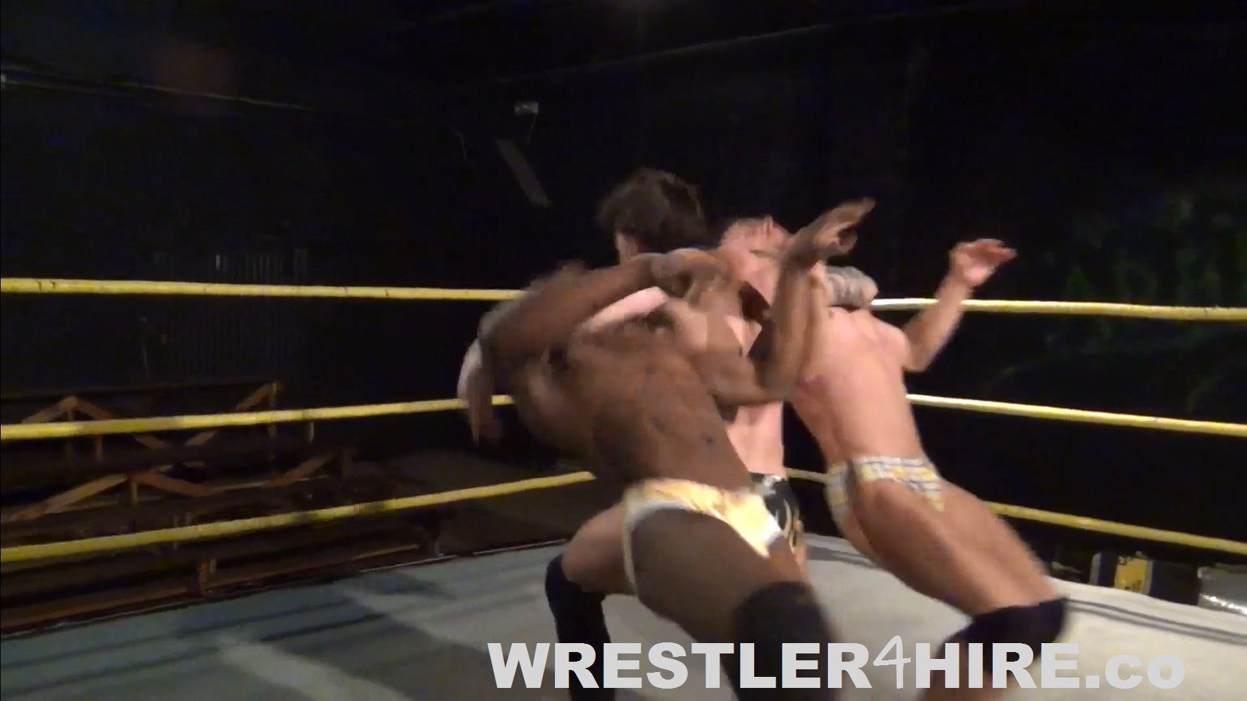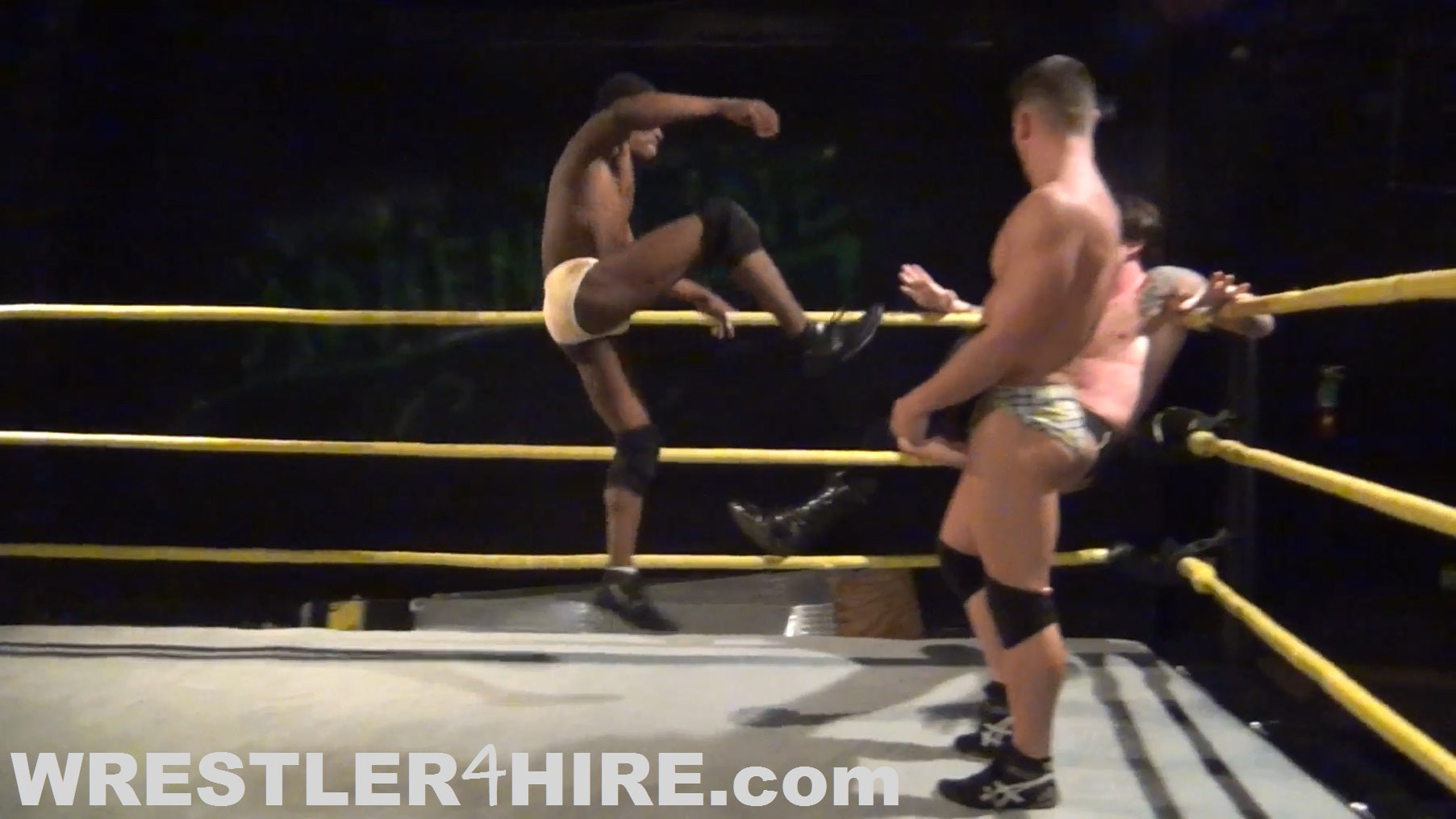 Yeah, these two dudes have their minds on only one area...Karn’s groin. But this ain’t no Double Teamed match! Suddenly Karn has both boys trapped in a double headlock, a move that only enrages the Tweedles to a heightened level that puts everybody’s junk on the line.