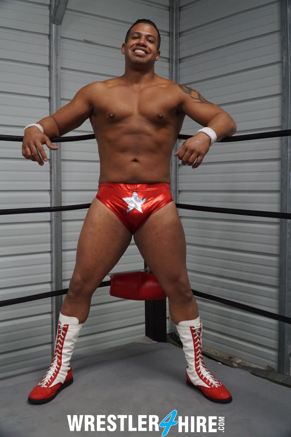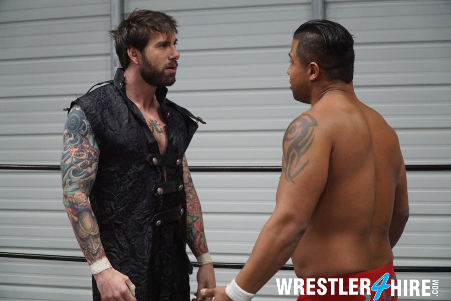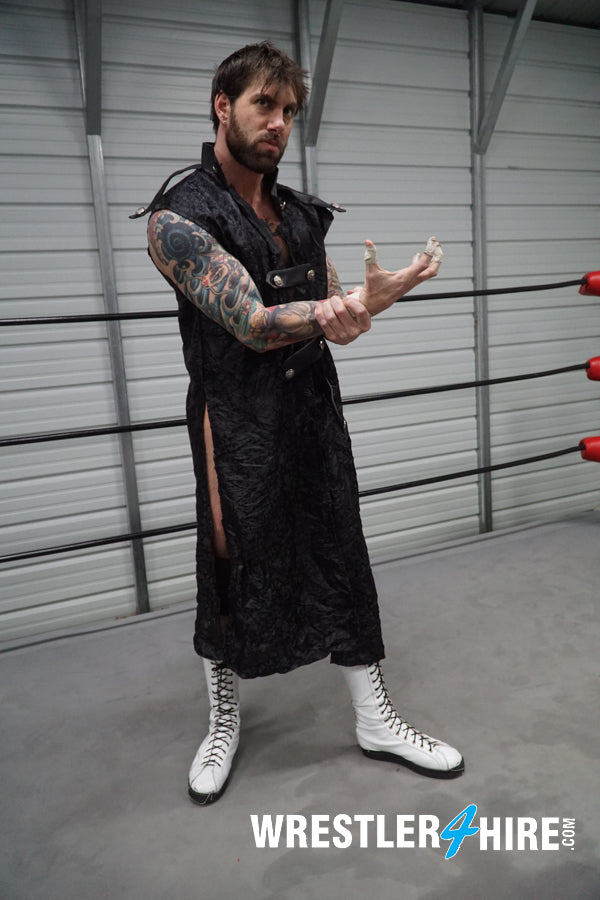 Suddenly Karn is ripping off his Gothic costume and demanding Gabe call him “The Man.” Karn grinds his white boot into Gabe’s package with slow, deliberate pleasure. Karn tosses the big boy with ease, lifting him into a backbreaker like it’s nothing, and crushing his balls with a clenched fist that gets Gabe kicking and struggling in extreme agony. Skill he refuse to give Karn the satisfaction of calling him the man.