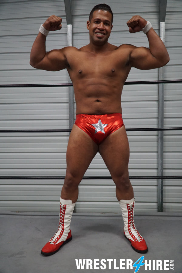 Karn brags about his own impressiveness as he swoops and poses in a Gothic costume. Gabe Steel, a big and beefy hunk of handsome heel, isn’t impressed by what he sees. Caramel-skinned and seriously sensual Gabe sports a shimmering pair of speedos emblazoned with the words STEEL in silver letters. But steel can be bent!