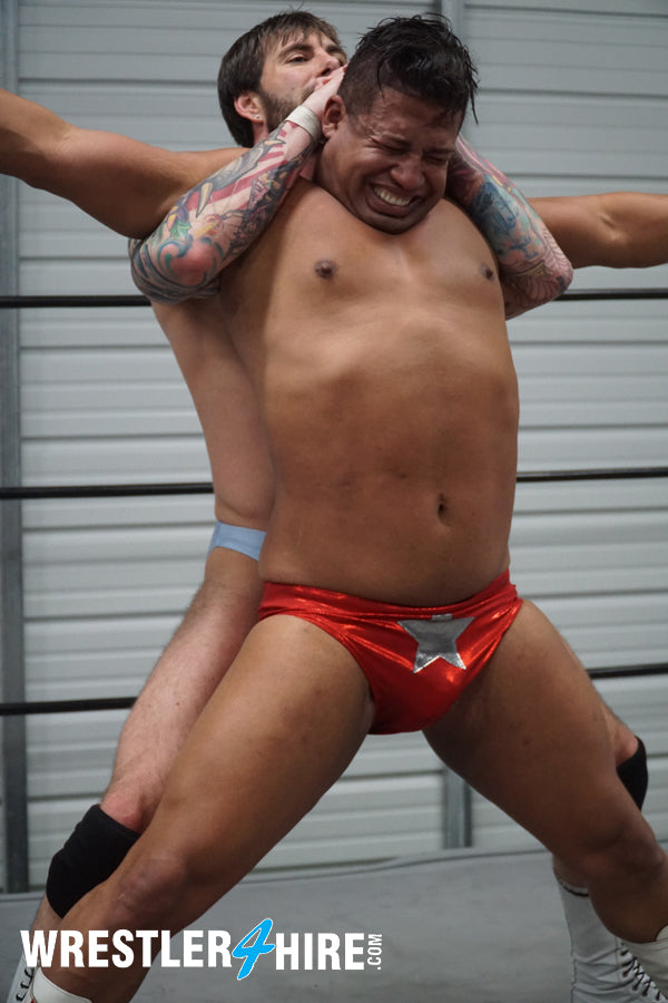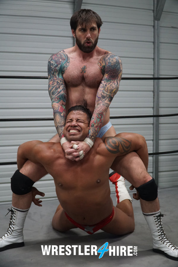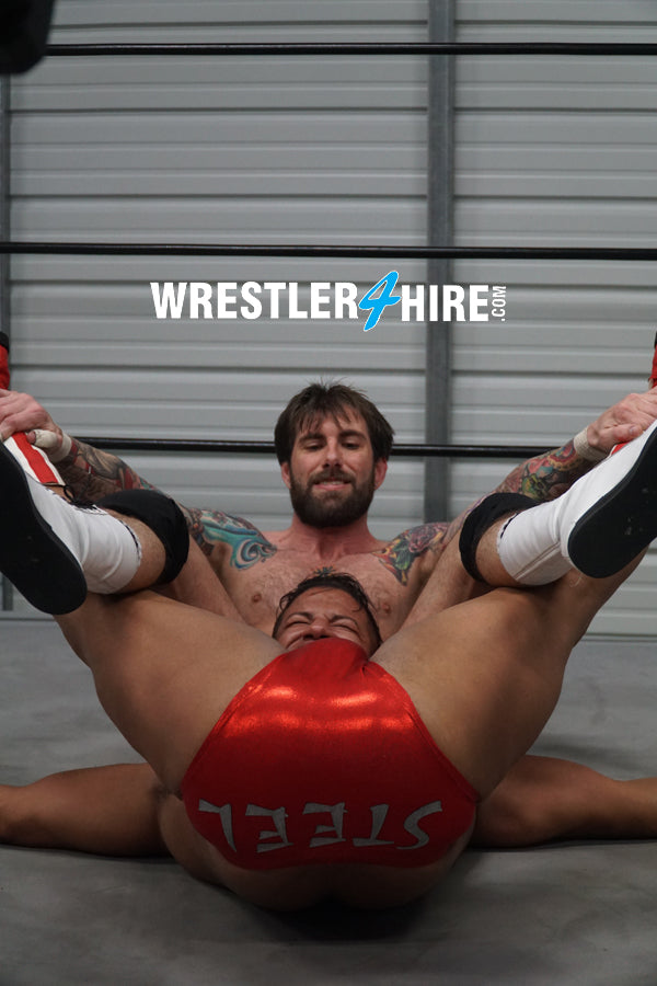 One has to admire Gabe’s stubbornness. Figure fours, scissors, gut punches, and against the ropes punishment leave Gabe shaken, but still stubborn. At last Karn exacts his most painful punishment on Karn, pulling him into what might be the most epic spladle ever filmed. It practically happens in slow motion with Karn locking Gabe up while standing, allowing the hold to literally fall into place as the two of them timber to the floor with a resounding thud. Can Gabe hold out in this humiliating hold? Or is Karn “The Man” after all?