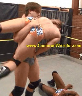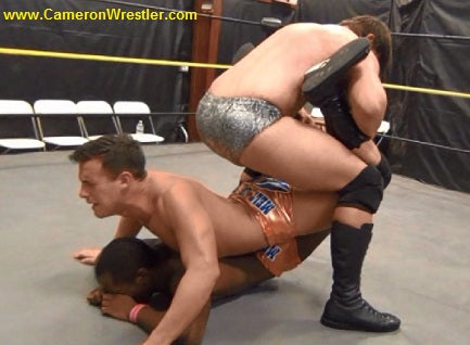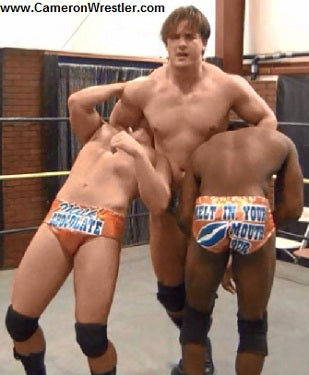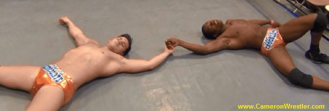 Chastain and James suffer in tandem! Hartley forces these boys into a double Boston crab, Chastain on top of James, until both boys are literally sobbing, faces twisted in excruciating pain. He does push-ups on top of them, his full weight evenly to their brutalized bodies. He throws them overhead, both at once! It’s pure strength against pretty, sculpted bodies. Who do you think eats the mat in the end?