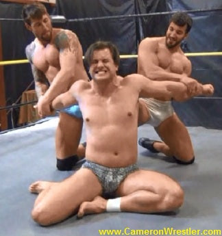 So here it is: Lane Hartley with barefeet getting dominated two-on-one by a muscle-God (Maverick) and a lean powerhouse (KARN) from this October. Lane is definitely out-matched with these two, but he does suffer so, so well. Lots of creative double-team moves are used all over the destroyed body of Lane.