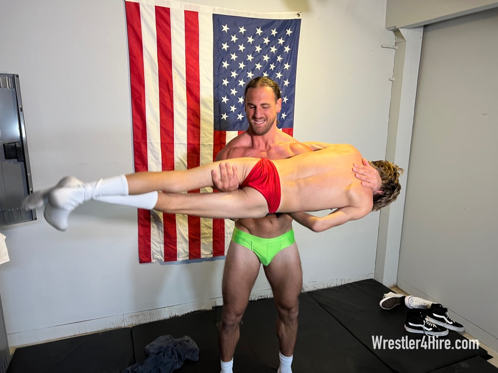 Toying with the smaller guy, Angelo decided to put him to good use. He hoisted Frank into the air effortlessly and began using him as a dumbbell, lifting and pressing him with the ease of a seasoned jock. The nearly 100-pound difference between them was astonishing—Angelo’s sheer mass and strength made Frank look even smaller than he was.