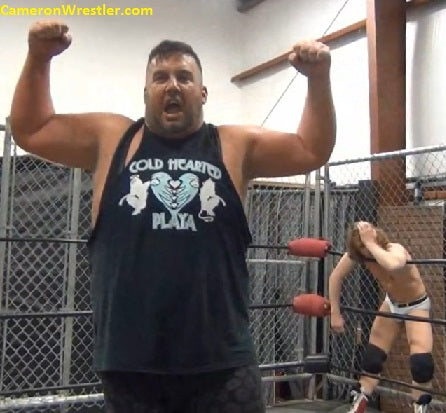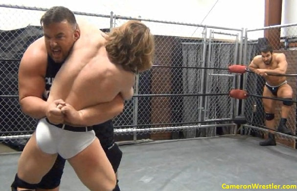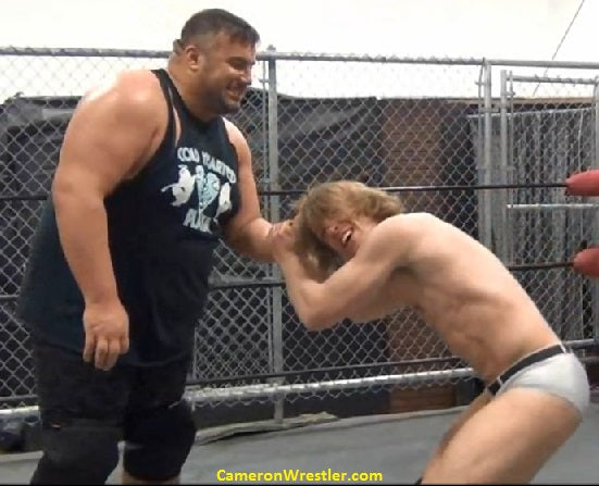 DeMented has two. How much you wanna bet he’s talking about his fists? Maverick makes the obvious rude remarks about DeMented’s size, while DuMont attempts to defuse the situation, but it’s far too late. The giant helps himself to a handful of DuMont’s easily accessible hair, slamming him to the mat by way of his favorite move, simply called the “punch”! Finger-locked tests of strength become package bashing, as physically perfect Maverick finds himself elbowed, slammed, and shamed by DeMented’s smashing, crushing, squeezing powerful holds, with every punishing moment feeling particularly well-deserved!
