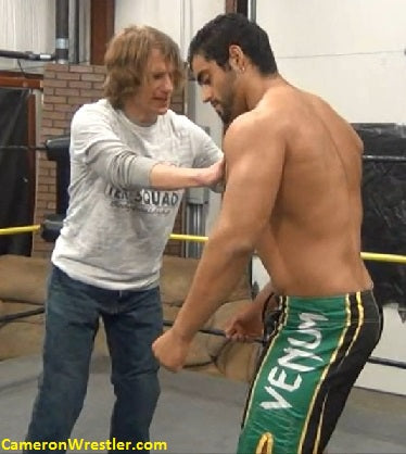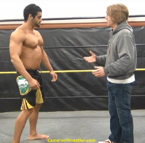 Marc Merino is sparing on the ring and flexing is big muscles when Lon Dumont shows up. Lon tells him to help him and giving him some help. But as soon as he can he delivers a low blow to Marc to start the fight.