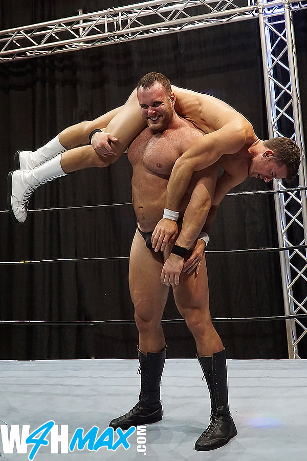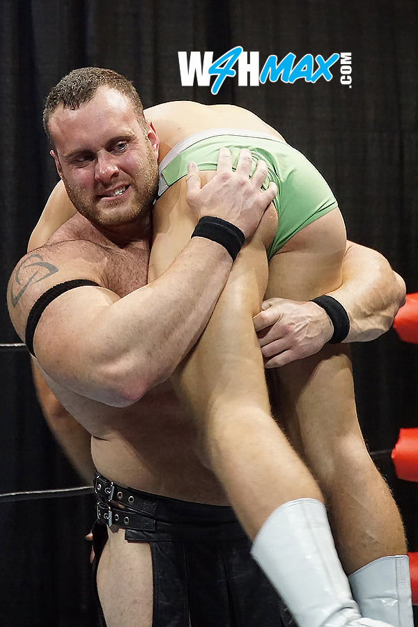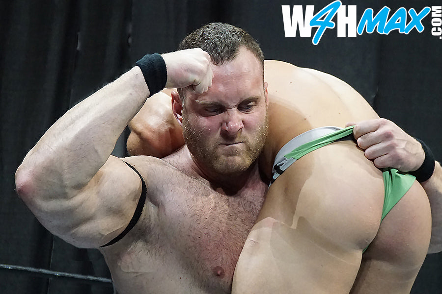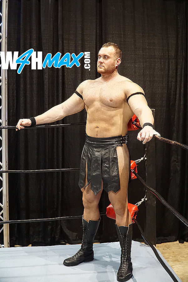 Blake Starr’s been eating a lot of mat lately, but nobody looks better in mint green trunks and white wrist cups. The camera eats him up, that lean body packed with muscle, hair, and hunky confidence. Enter Mark Muscle in full gladiator regalia. We’re talking leather battle skirt and everything. If you haven’t had the pleasure of meeting Mark Muscle yet, let’s just say he’s massive.