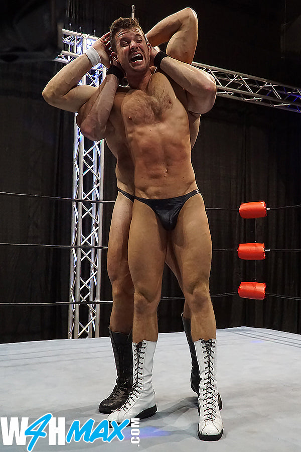 “Where the hell did you come from?” moans Starr, and you’ll be thinking the same thing when you see this hairy titan hoist Starr off his feet by his neck, and bend him over his knee with backbreaking brutality. Mark’s the strong and silent type, few works and even fewer moves, but the ones he’s using are effective and painful, leaving Starr struggling for release. Pecs are manhandled, legs are forced into impossible positions, and Starr’s g-string-clad butt is ridden so hard his balls fall out in humiliating high def.
