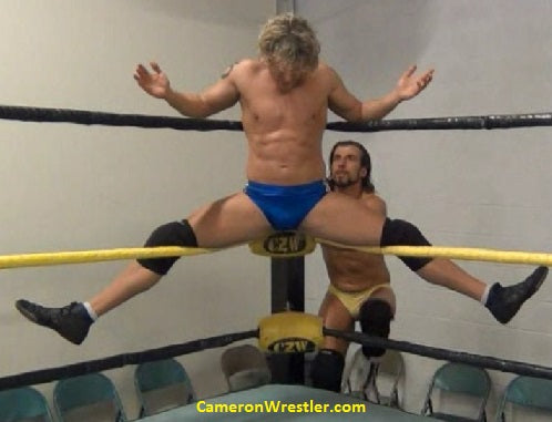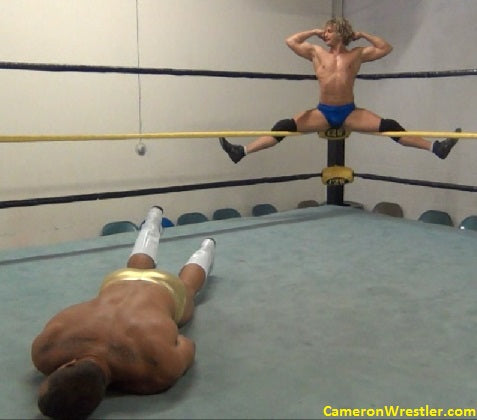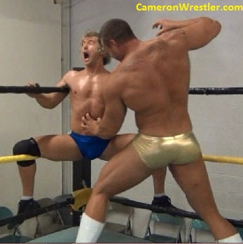 Pec punishment, ball punishment, and a killer headlock reduce Mark to a puddle of manmeat, making this brick wall of a man into a fit of struggling and straining that must have looked like a muscular blur of tattooed stars, bass clefs, and om symbols.