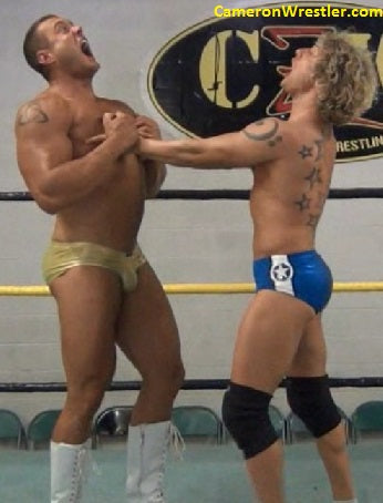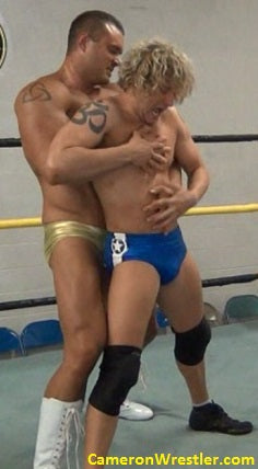 Mark begins by putting Mike in a sleeper like something out of Greek mythology, with biceps the size of Mike’s head, asking this lithe and cocky newcomer what really matters...muscle or flexibility? Mikey fights back, locking his arms around the giant’s torso with a fight and vigor that soon travels up to Mark’s impressive neck, rendering him red-faced and raging.