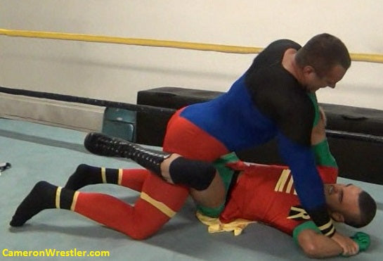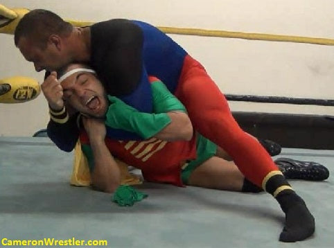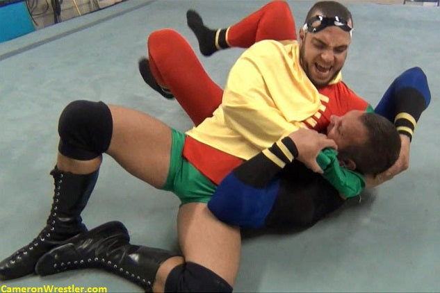 With a huge height/weight difference between them, these two heroes rip into each other with unabashed force, rolling all over the mat in an almost comical display of speed versus size. The sidekick achieves the first killer headlock, only to be lifted off his feet, kicking and flailing and bargaining in a pseudo-Shakespearean delivery that will make you want to climb into the ring yourself and hang this wannabe upside down.