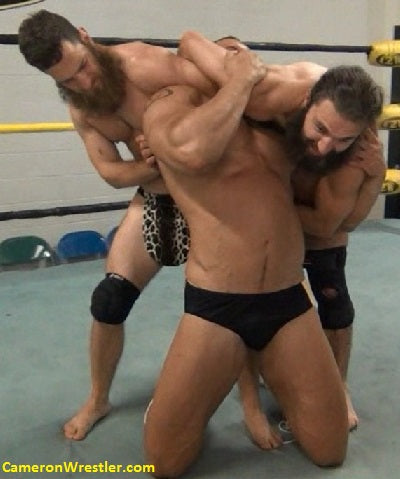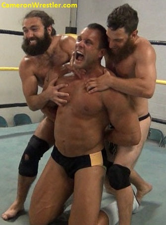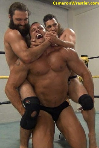 The exhibition of strength continues, and this primitive Tweedledee and Tweedledum clamp their inferior arms over the big guys face, making a mountain to his knees in a devastating double choke hold. They punish Mark’s pecs, which are bigger than their hands, opening the door for a series of especially nasty pinching, twisting, and generally mean-spirited, smaller misdeeds.