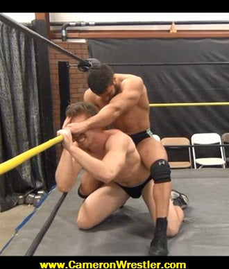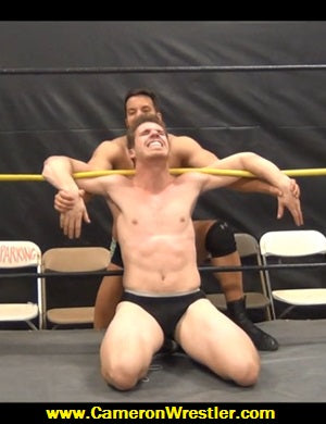 Oliver, for his part, suffers like a champion, never abandoning his intense dream of getting away, while enduring chokes, leg attacks, and a cruel back breaker that has him sobbing, pleading, and gasping until he is rolled onto the mat in agonizing pain for the master to apply an aggressive camel clutch. But this play toy’s only fun when it’s reacting properly to the punishment being dished out, so next it’s more offense with the chain, and a strangely satisfying session with the ropes that has Maverick taking his aggression out on Oliver’s face!