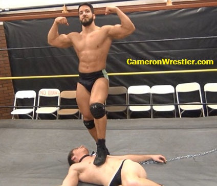 Professional lifeguard Alex Oliver comes to dog-collared and chained to the turnbuckle of a wrestling ring. The tight-bodied tool strains against his bonds until master Maverick darkens his doorstep with his impressive physique. The truculent master is none too quick to help the struggling rookie who just wants to get out and get home. Maverick relents, releases Oliver, then turns the heat on, choking the newly freed Oliver with his former chains...another toy for Maverick to play with.