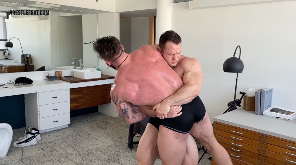 Steel is physically impressive as ever; Scotty is a manly mountain of muscle. While I knew this video would be treat for the eyes just watching these two incredible physiques, I didn’t have very high expectations of the wrestling quality. Was I ever wrong! The action is only limited by the location (a bedroom), and these two trade holds and advantage during the full length of the match. Scotty is a gem of a find. I hope he makes many more matches!