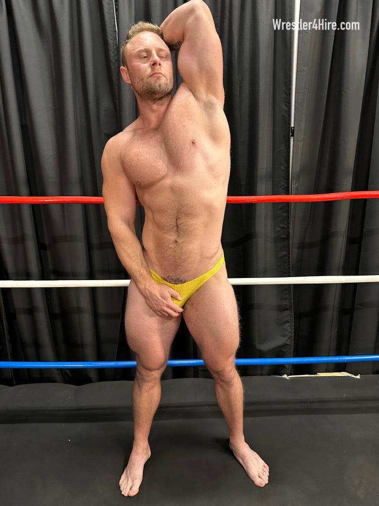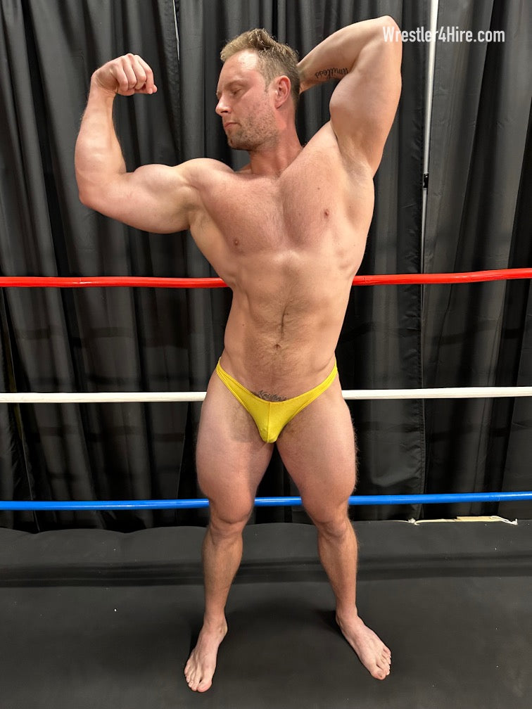 This of course sets Meaty off and before you know it, Meaty has lifted the smaller Vegas in the air and has him in a reverse bearhug, something from which Vegas is unable to escape. Meaty basically has his way with Vegas and before you know it, things have calmed down a bit and Vegas is once again using his hands for some muscle worship of the bigger, more muscular Meaty. Meaty seems to be enjoying the attention from Vegas, at least until Vegas once again finds himself with a firm grasp of Meaty's balls. Writhing in pain, it is all Meaty can do to try and escape, and once he does, he puts the hurt once more on Vegas, who may be regretting his sneak attacks.