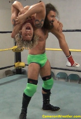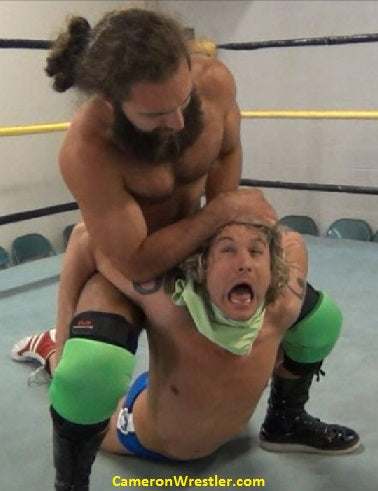 A frustrated Reno fights dirty, attacking with sudden ball bash, a crushing knee in the neck, and even a merciless choking session with the straps of his singlet, which he soon pulls down to expose that legendary hairy chest. Reno molds Splitz like clay, muscling him into one hell of a backbreaker that tests even this flexible fighter’s adaptability. Before long, fists are flying, bodies are flying, and one lime green singlet gets passed back-and-forth to be used as an object of control and humiliation. Get up close and personal in a total fight to the finish that ends in a brutal figure four and shoulder carry!
