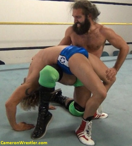 Snapping a lime green singlet and sporting his East Williamsburgian man bun and beard, Reno has to admit angelic-looking Splitz has the flexibility, but Reno can’t wait to turn on the pain for this yoga-teaching prettyboy.