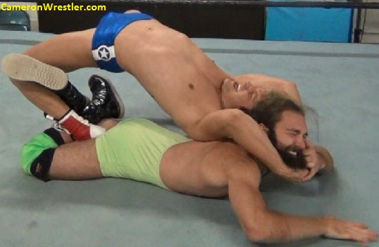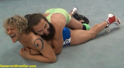 And it’s on! Despite their difference in appearance, these guys are evenly matched in size, age, and attitude. Splitz blows Zach’s mind with a wriggling escape from what should have been a debilitation hammerlock that has the yoga instructor trapping his opponent’s head while executing a flawless bridge! Unable to match Splitz’s uniquely pliant technique, Reno responds with pure, animalistic bearhugs, doing everything in his power to prevent the golden-haired pro from using those limber limbs of his.