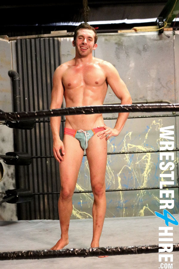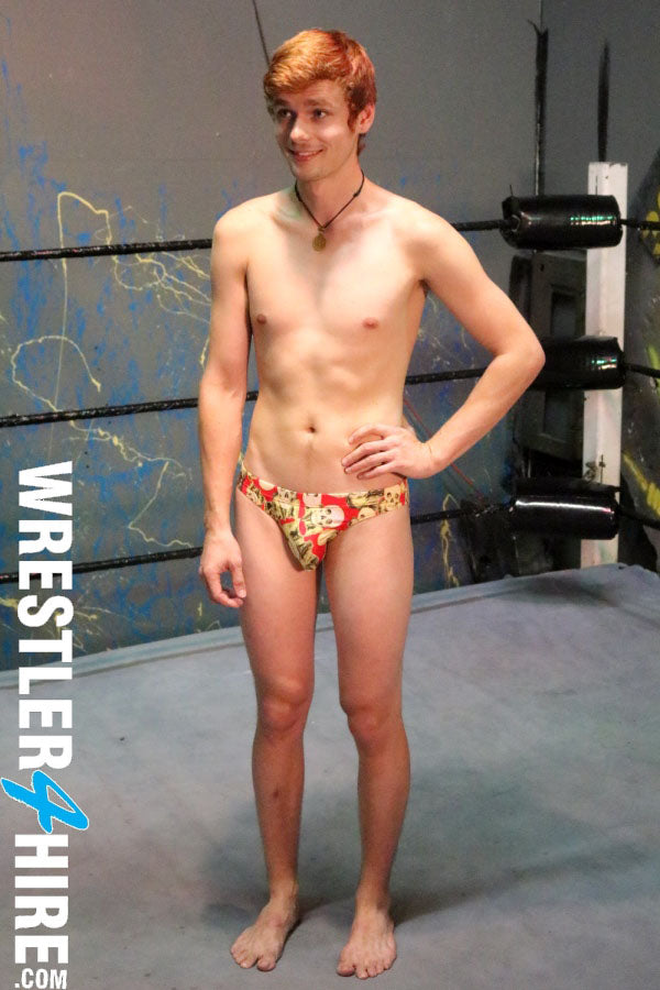 Nathan has Matty onto the mat almost instantly, getting him tangled in the ropes and struggling for an escape. Matty tries to blow it off and says he’s just getting in a good stretch. After both men get back on their feet, Nathan once again takes control of his smaller opponent, snapping him down to the canvas, followed by some elbow smashes and some serious twisting and stretching of little Matty’s right arm. Based upon his lack of struggling to escape and the expanding bulge in his skull-covered trunks, little Matty appears to be enjoying the punishment. Nathan releases the hold on Matty’s arm, allowing him to get back on his feet, but is definitely out of breath and is backing away from his bigger opponent. Nathan backs him into the corner where little Matty tells him not to mess with his hair, almost as if he is daring him to do it. Nathan takes the dare and quickly rubs his hands through the ginger strands, clearly annoying Matty. Matty braces himself on the corner ropes and plows both of his feet right into Nathan’s abs, sending him down hard onto the canvas, followed by a quick kick and schoolboy pin. To further embarrass his bigger opponent, he rubs his manhood all in Nathan’s face. Nathan is then subjected to a painful body scissors and twisting of his arm with some serious pressure applied to his elbow. Little Matty has more strength that what appears on the surface, yet he releases the hold and tells Nathan to get up. Nathan jumps off the bottom rope, shoving little Matty down and putting him into a twisting neck scissors. Matty struggles his way out of the hold, then gives Nathan a quick shot to his manhood, sending him down to the mat. Matty once again uses his schoolboy pin, placing his nuts right on Nathan’s face. Matty, then twists Nathan’s legs like they are a pretzel. Nathan is grabbing the bottom rope trying to gain some leverage, but it works against him as Matty stretches him back even further and brings Nathan’s feet back far enough to touch his own hands with them. Nathan is definitely feeling the pain. After a quick slap to Nathan’s abs, Matty releases the hold and we see Nathan use the ropes to pull himself up off the mats.