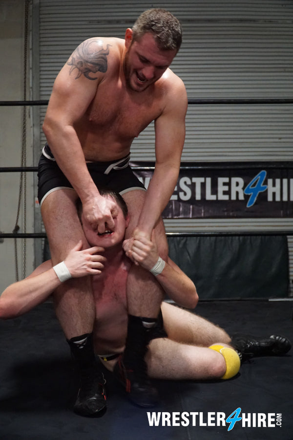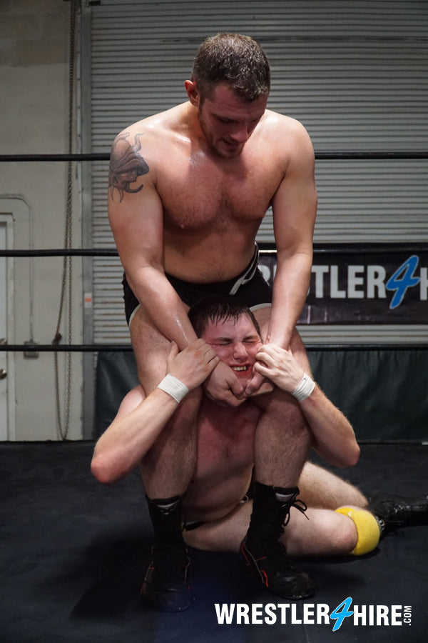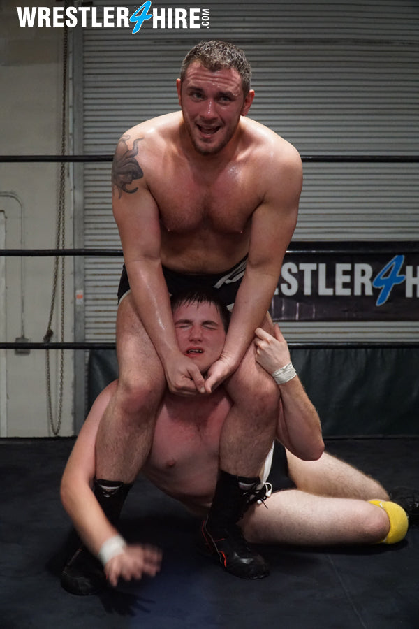 Noah will literally not know what hit him. After Justice’s infamous f-bomb opening trash talk, he wastes no time in dropping Noah to the mat, proceeding to punish Noah with a series of crushing elbow drops. Justice drags him face down back to the center of the mat, and you will feel Noah’s skin burn and hear the whimper as he contemplates what might be coming next. Justice keeps asking him, “Are you going to be my minion?!” Yet Noah remains defiant. We’ll see how long that pride lasts. Because with each of Noah’s weakening “No’s,” Justice’s “Wrong answer, bitch!” retorts take on an ever-more evil roar. And there’s no denying Justice’s skills. He can maneuver with ease from a back-breaking Boston crab, to a full lift of the pretty boy over his head for a bone-crushing body slam. You are going to experience the encyclopedia of classic wrestling moves, while every ounce of dignity is stomped, slapped, gouged, knee’ed, choked, slammed and nipple twisted out of Noah.