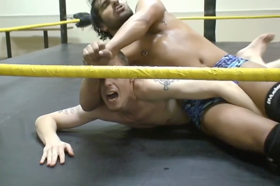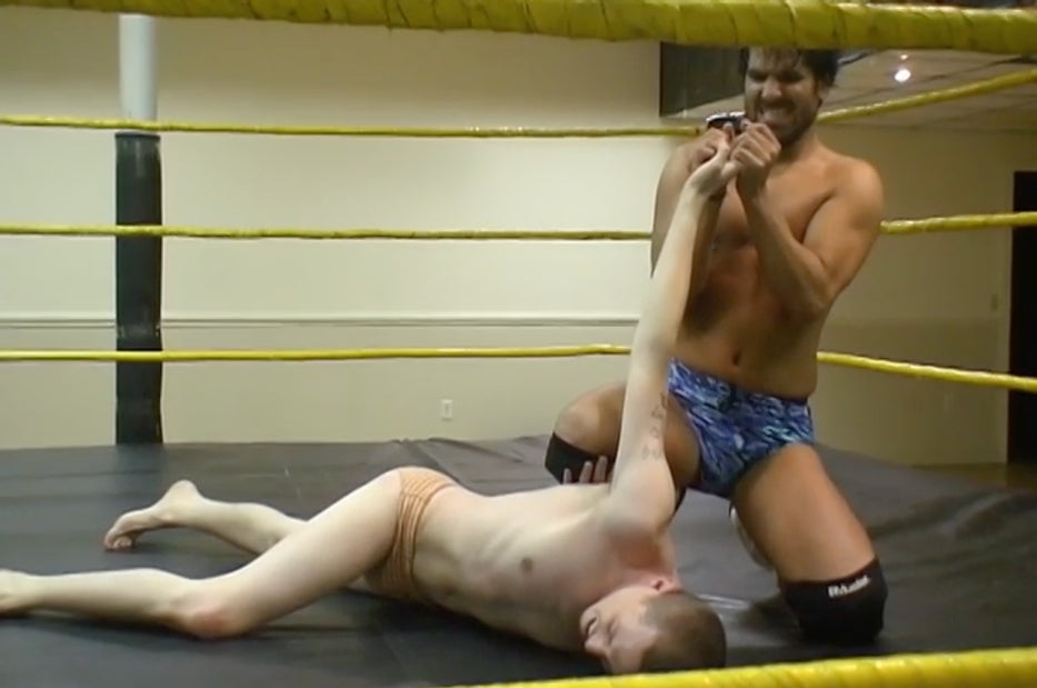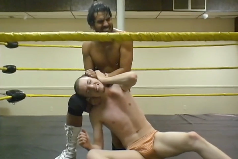 These two meet up in the back of a Pizzeria (no joke) where we've done countless live pro wrestling events with fans. Tommy is a total jobber for the aggressive, dominant heel who tears the rookie apart with some vicious holds and heel tactic such as eye rakes, fish hooks, deep dragging back scratches and double boot stomps to the un-muscled chest of twink Tommy.