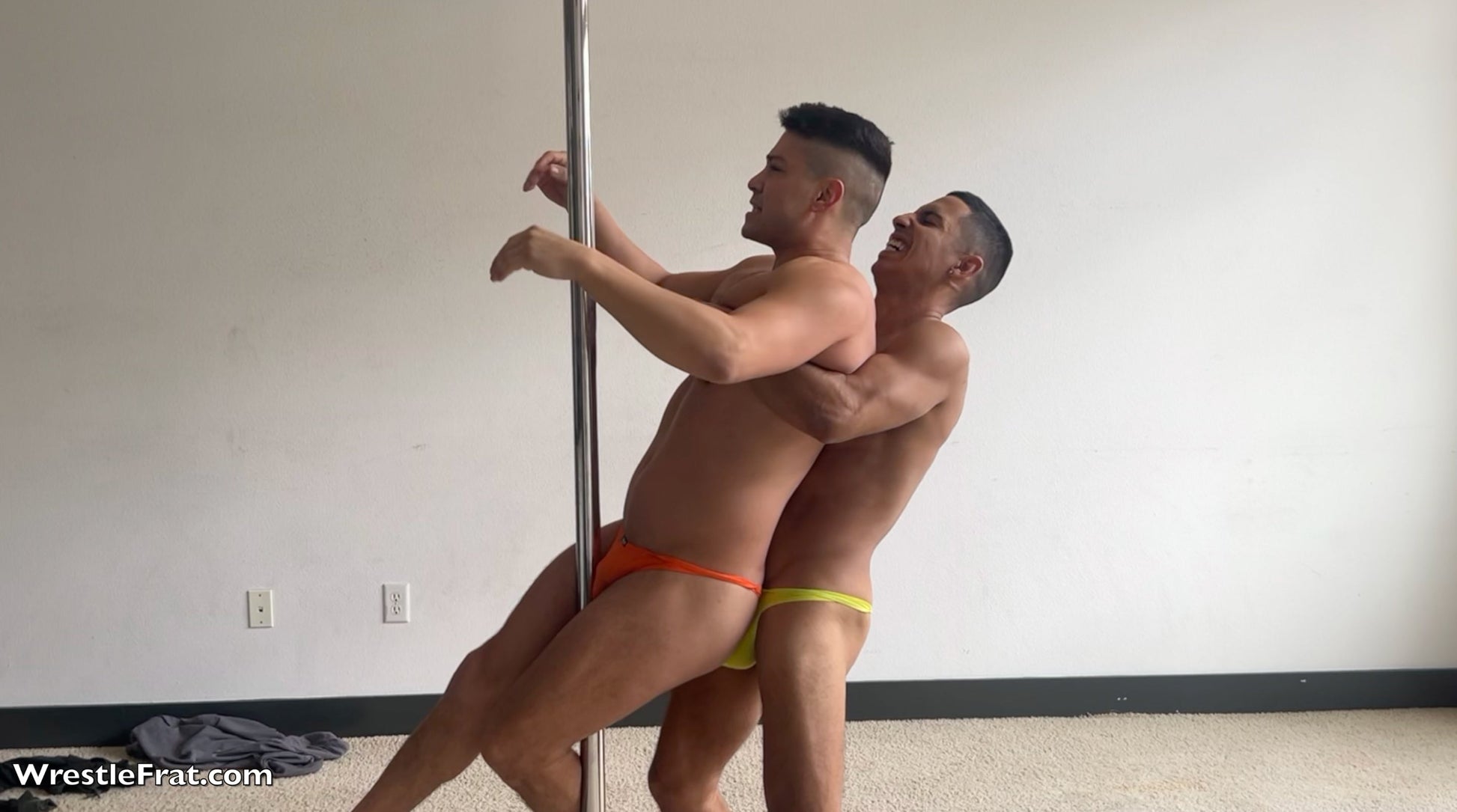 Johnny, alone with a metal pole, does some acrobatics around the pole. As he is doing this, Santos enters the picture and before long someone has accidentally bumped into someone else and the two decide they need to settle things through beating each other. Santos gets the better of the opening moments of the video, taking it to Johnny, who is now in just a orange thong. To even the odds, Johnny strips Santos down to just a yellow thong, and the pair trade ball claws, blows to the chest and leg scissors.