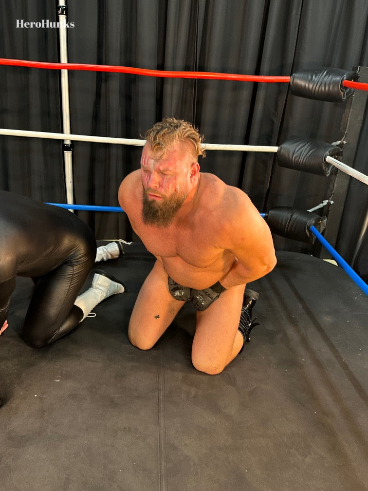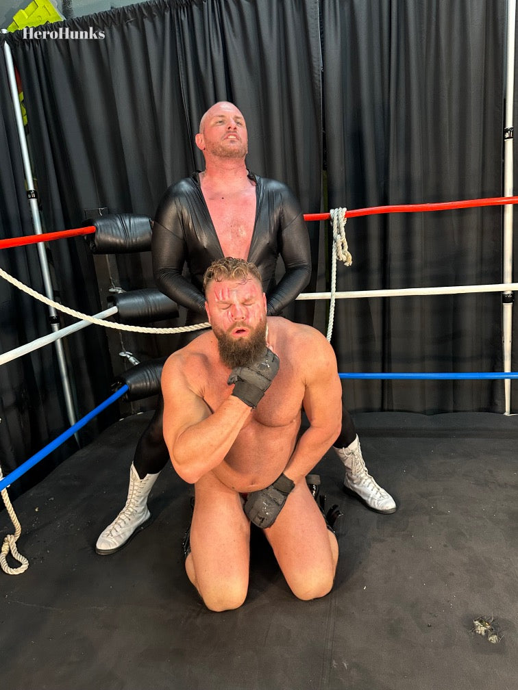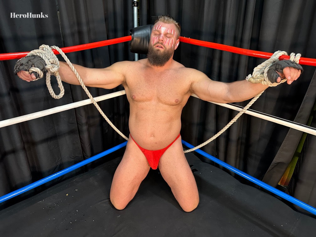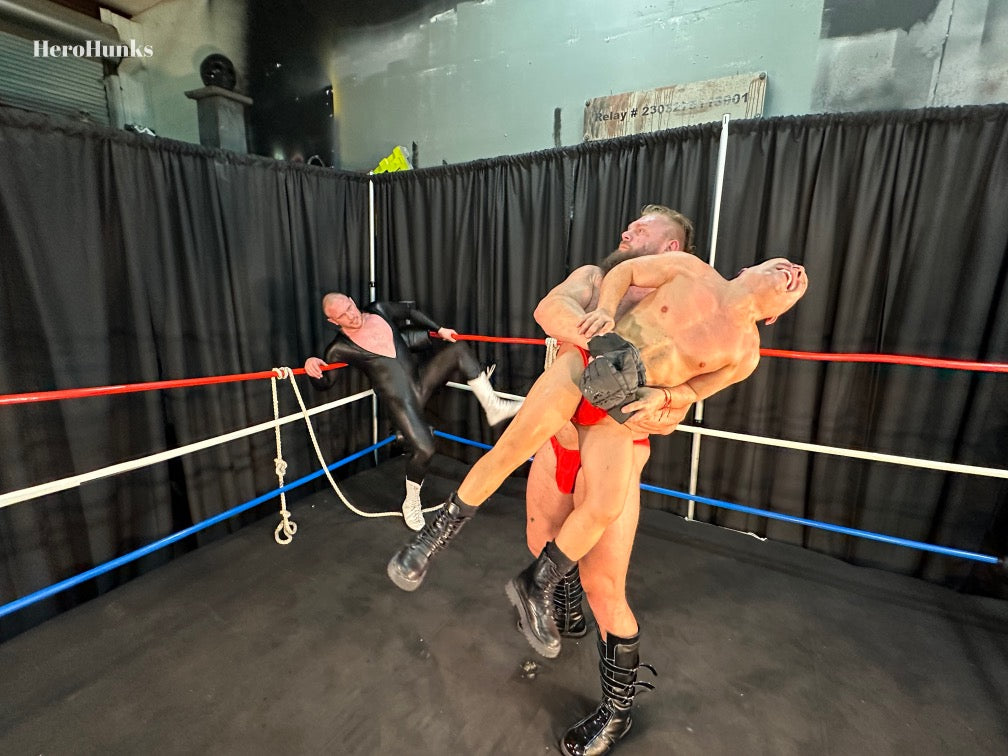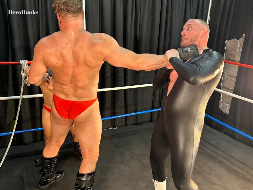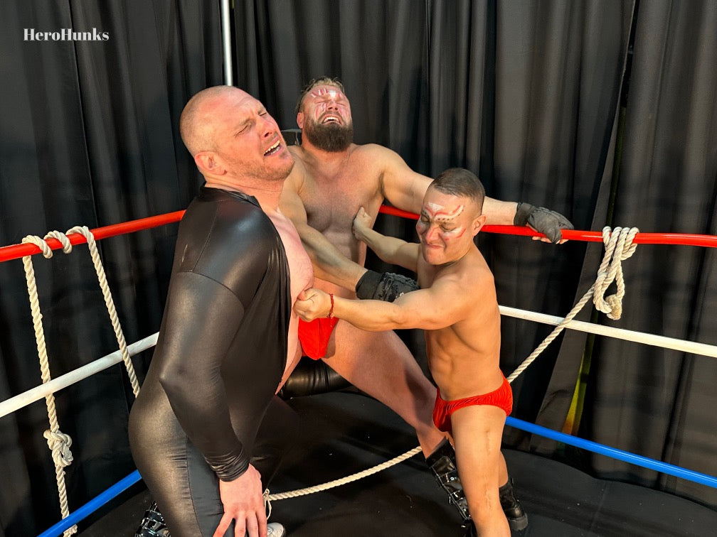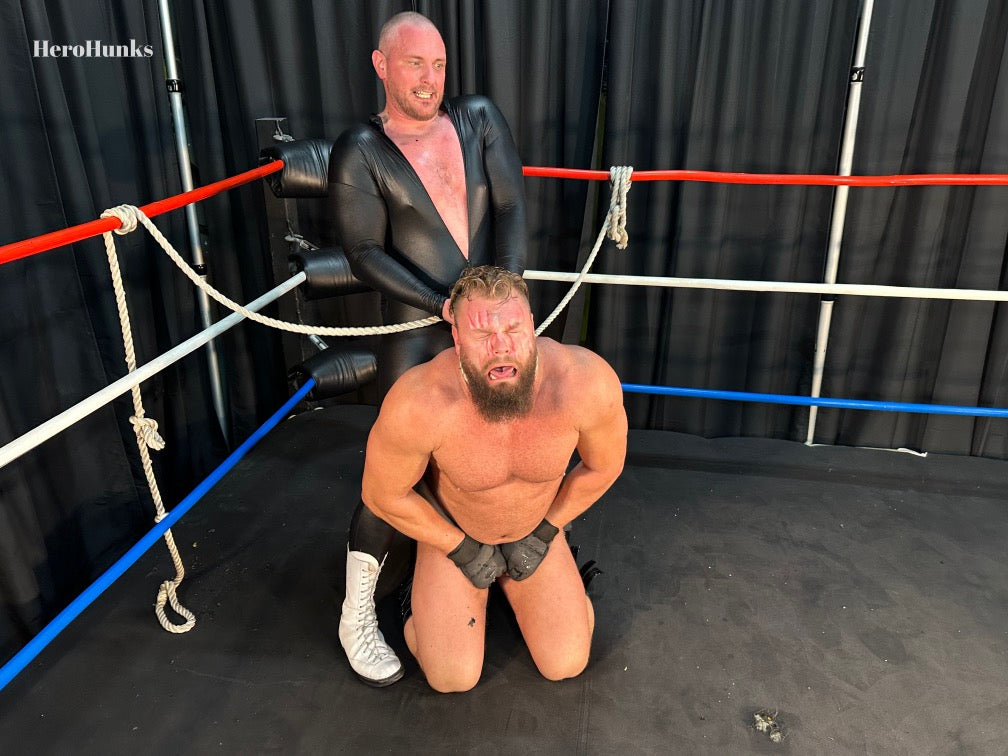 As if to add insult to injury, while he has him bound, Justice decides to mind control Red Baron as well and allow both himself and Mini Baron to beat him within an inch of his life. Nipple twists and ab claws start off the torture, and then Nick Justice literally throws Mini Baron into Red Baron's midsection, his shoulder burying deep into Red Baron's abdomen. Nick dumps the smaller Mini Baron onto the prone larger Red Baron multiple times, and they take turns once more applying nipple twists and ball claws. Nick Justice is such a sadist that he even takes some time to twist his own nipples so he can take part in the joy of the pain.