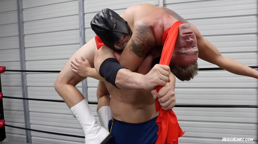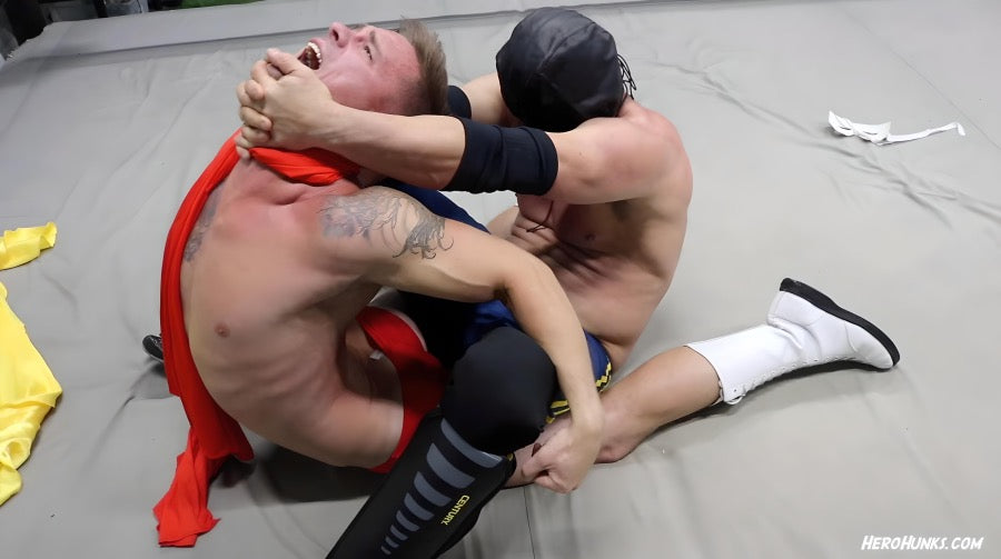 But the Stretcher is far from finished with Red Jay. Trapped in a modified Tree of Woe, with his legs suspended upside down in the corner, Red Jay's vulnerable abs become easy targets for the villain's merciless assault. The Stretcher then employs Red Jay's own cape, slinging the hero over his shoulder to inflict further torment upon his back. It becomes evident that the Stretcher is no stranger to the wrestling world as he transitions seamlessly from one hold to another, each more agonizing and devastating than the last, each designed not only to weaken but also to humiliate Red Jay.