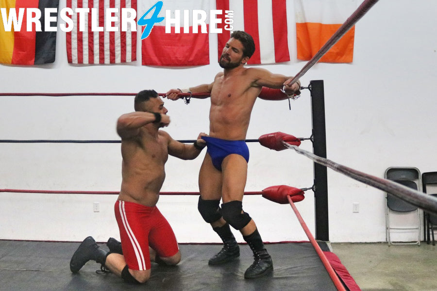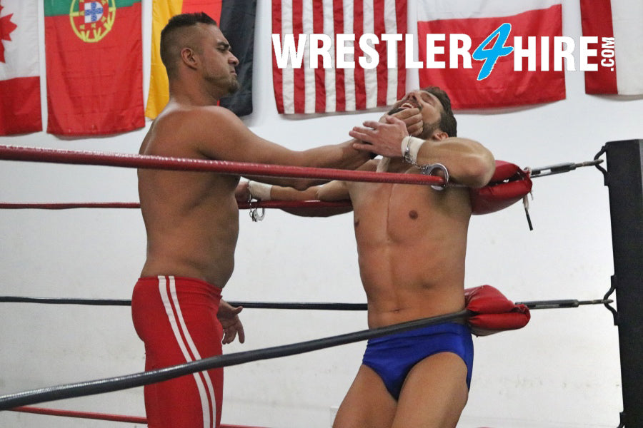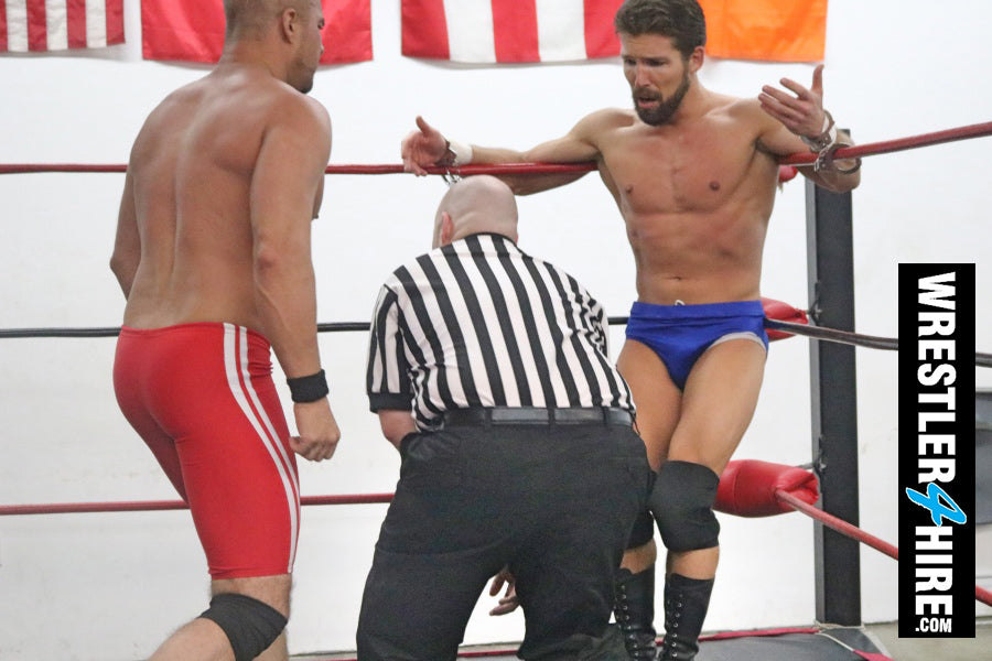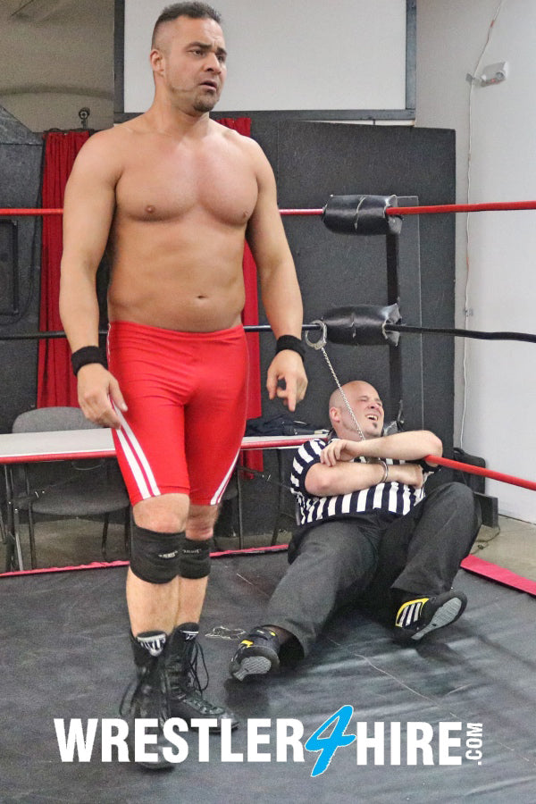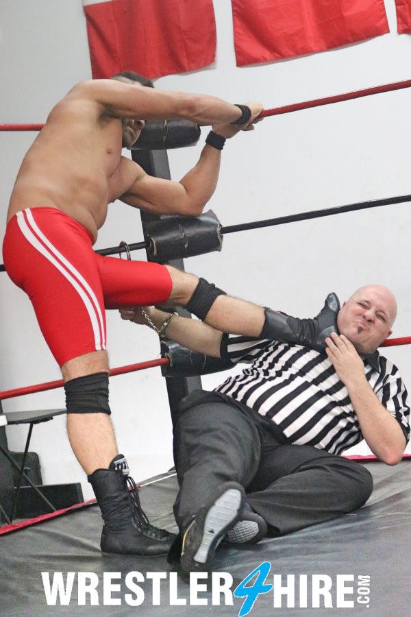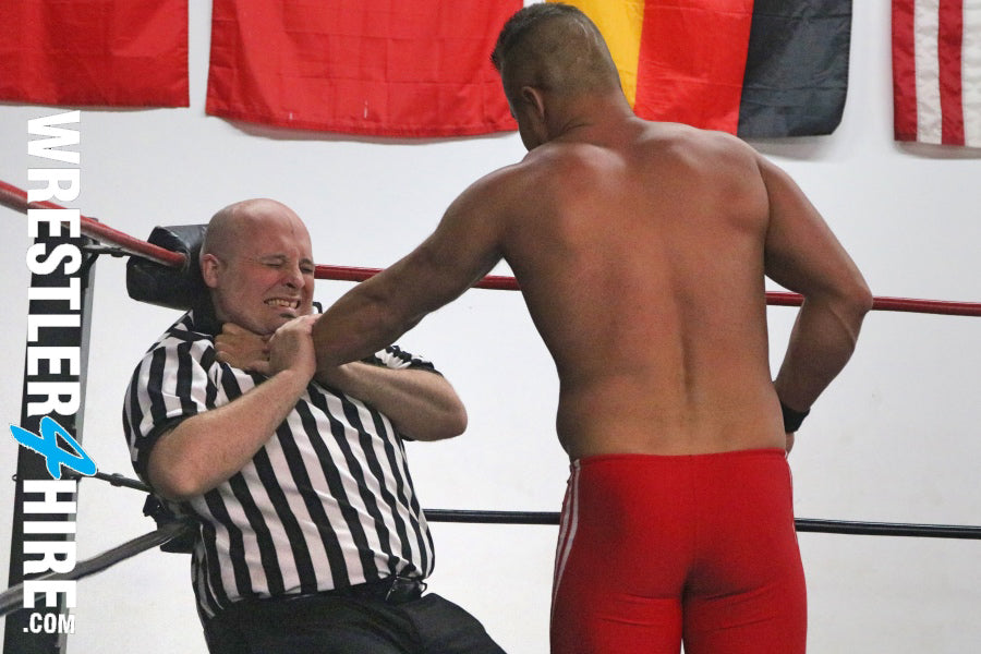 WAIT! It appears as if Ronnie is about to be rescued. From the back we hear, “What are you doing? You can’t do that!” In comes our cute little butterball ref to help. There’s only a couple of problems we see here. First, he’s a ref and not a wrestler – there is a BIG difference. Second, Teddy Trouble has less respect for the refs than he does the rules and his opponents. So much for the rescue. As the ref tries to help Ronnie, Teddy comes up from behind and does under his legs with a shot to the nuts that would make a grown man cry. He’s then dragged into a corner of the ring and choked until he passes out. As he is coming to, Teddy emerges with yet another pair of cuffs, using them to cuff the ref to the ropes. Once that’s done, a stomp to his chest proves who is in-charge. Now Teddy can turn his attention back to Ronnie.