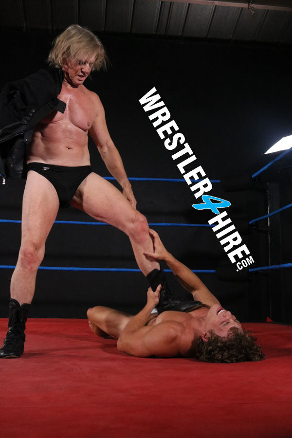 Father vs. Son. Experience vs. Youth Brock’s one hell of a strong, mature dude. He tosses his lion’s made and challenges the best looking, strongest studs on the Wrestler4Hire roster. Scrappy gets pulled into a full nelson, as he’s rolled and wrangled by Brock. Scrappy talks trash, but his face betrays his legit pain and suffering at the hands of this much older opponent.
