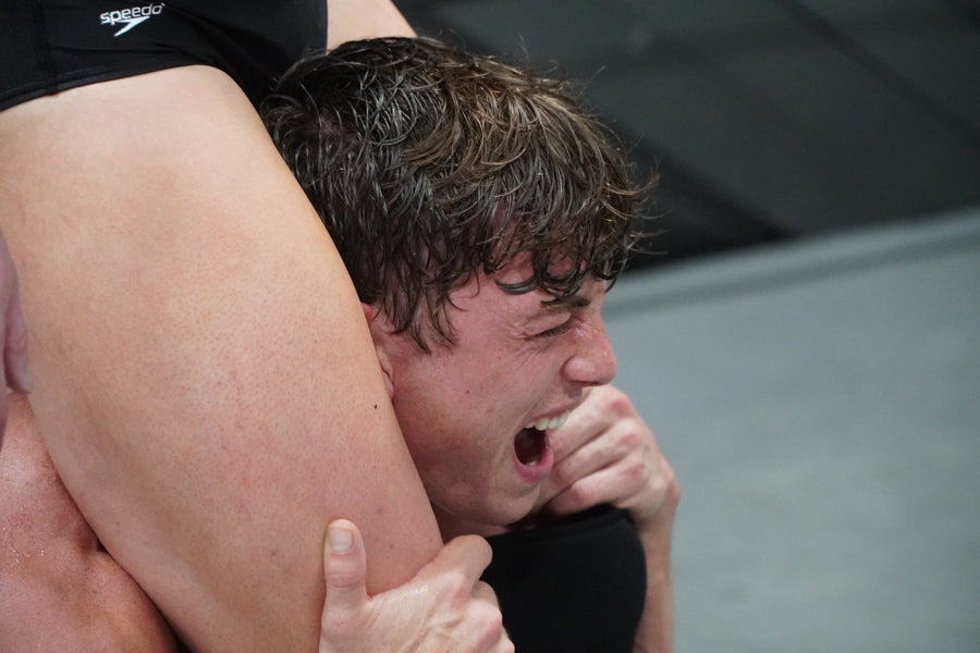 With a methodical and focused intensity, Calvin Rogers makes Scrappy suffer throughout this incredible match. Calvin also shows amazing power as he lifts Scrappy up to his chest three separate times , each followed by bringing Scrappy's back down hard across Calvin's knee. Yes, with the crushing power of his biceps, Calvin tortures Scrappy with multiple sleepers. The almost passive expression on Calvin's handsome face shows he's in total control and accustomed to being the alpha male.
