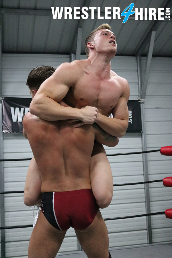 Elite slips into the ring unnoticed by Scrappy and attacks him from behind as he begins his full assault on the young pretty boy. Scrappy gets destroyed in the first few minutes of this match. Elite has full control and is loving it. Scrappy isn’t a jobber and won’t let Elite own him in the ring. He returns the offense he’s suffered so far. Elite is shocked by the comeback Scrappy has made. Scrappy even does push-ups on Elite. It isn’t long before sweat is pouring off of each of the muscle hunks. Just watching some of these holds leaves us wincing in pain. We can’t imagine how bad they must hurt to receive.